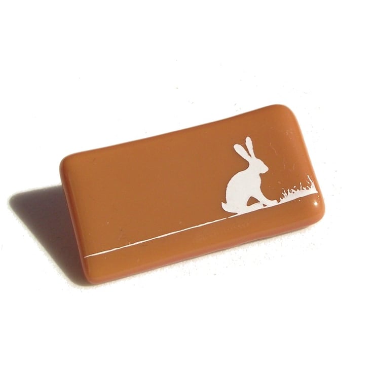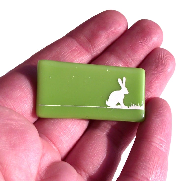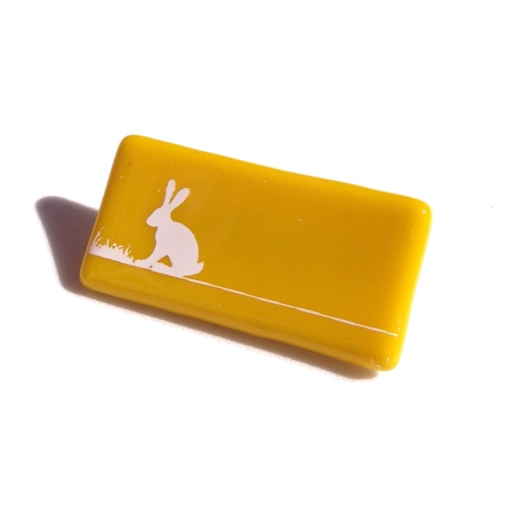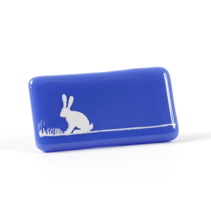 These brooches are handmade from opaque coloured flat glass with a hare silhouette design, hand screen printed in kiln fired enamel onto the surface. After firing, it is carefully digitally cooled for strength and safety, before being mounted on a nickel-free silver plated brooch finding and come in a gift box with a story card.