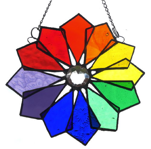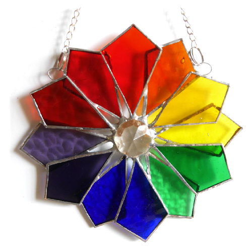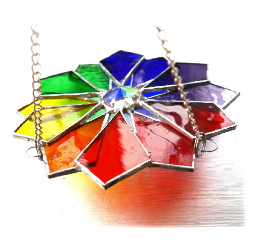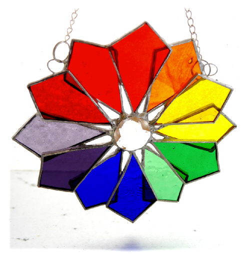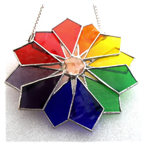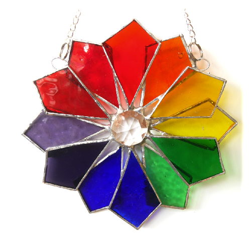This is a stained glass suncatcher made using the Tiffany copper foil technique.