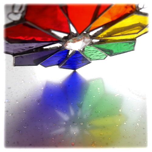 The sails are diamond shaoed and in 6 colours of the spectrum with two pieces of different glass for each of the colours.