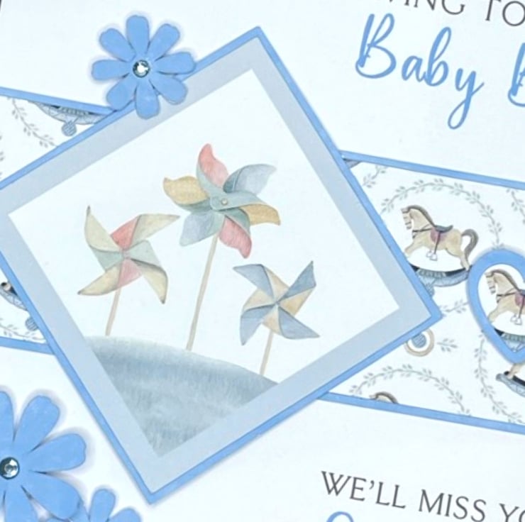 The card features an image of three children's windmills. It has a blue border and is complimented with blue flowers, gems, decorative rocking horse paper and a 3D heart.