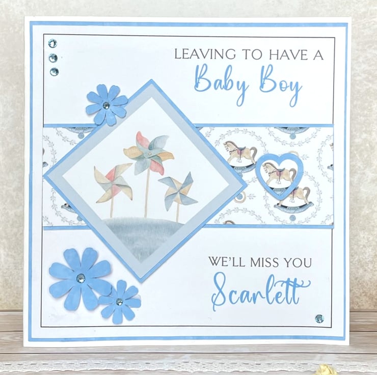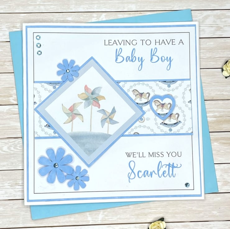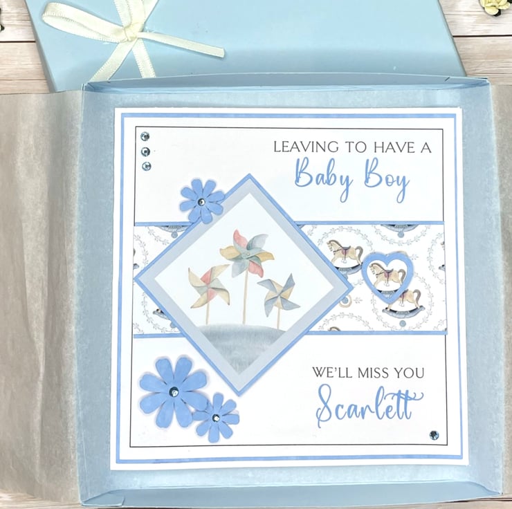 The wording on the card reads, "Leaving to have a baby boy, we'll miss you" and can be personalised with the name of the mummy to be.