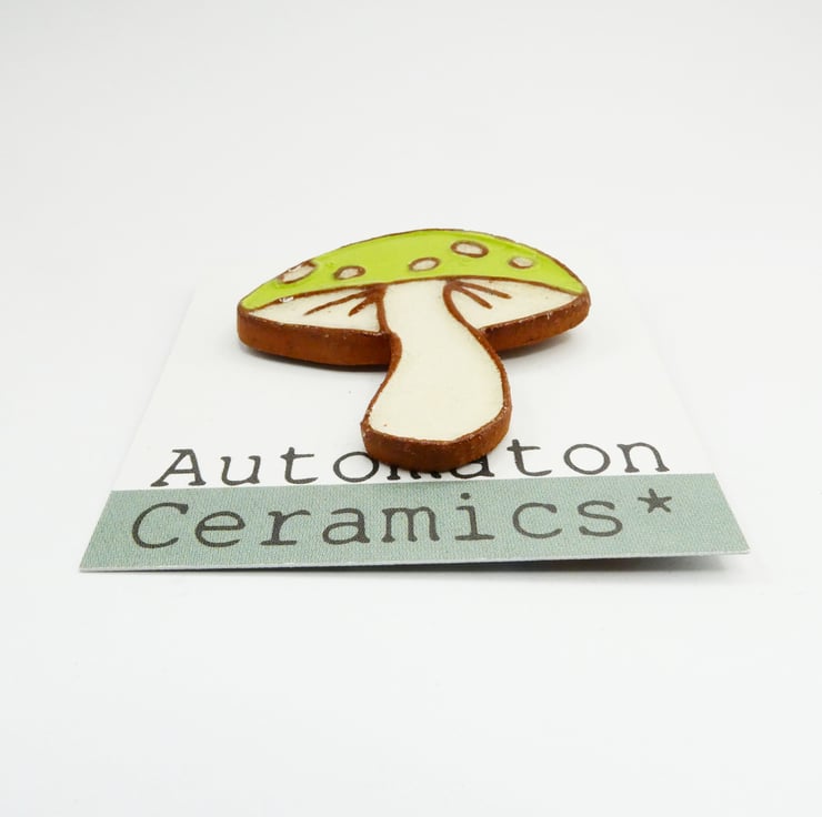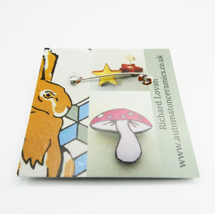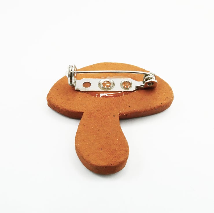 Ceramic mushroom brooch that depicts a fairy tail fly agaric toadstool. These toadstools are one of my favourite when walking through the woods. Steeped in legends and folk law they can make a woodland clearing into a very magical place.