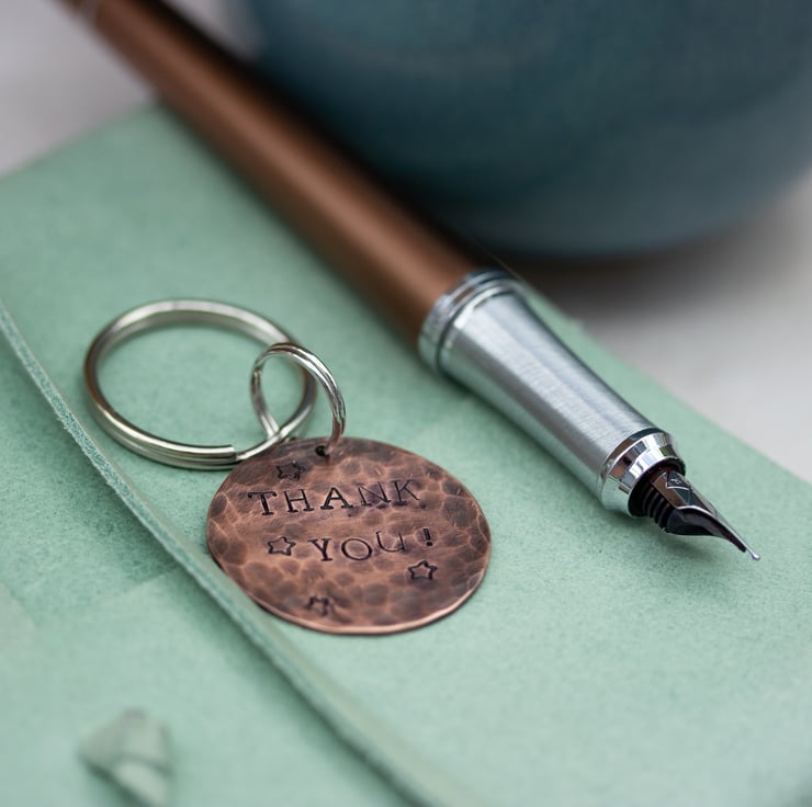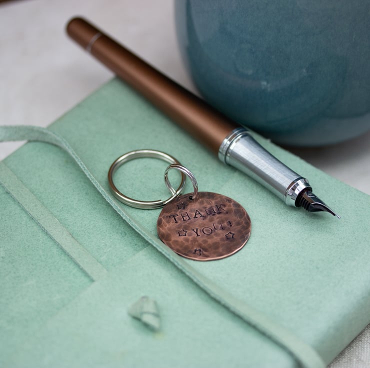 Copper hand stamped thank you keyring, a perfect small thank you or teacher gift.