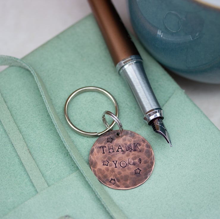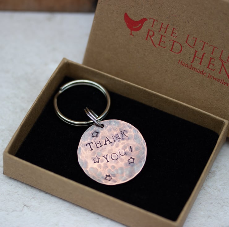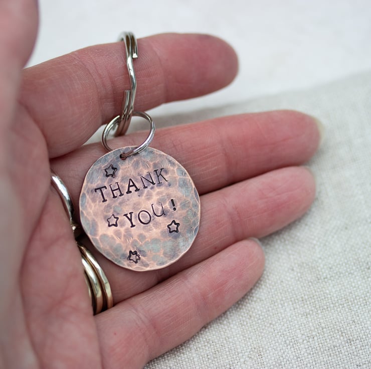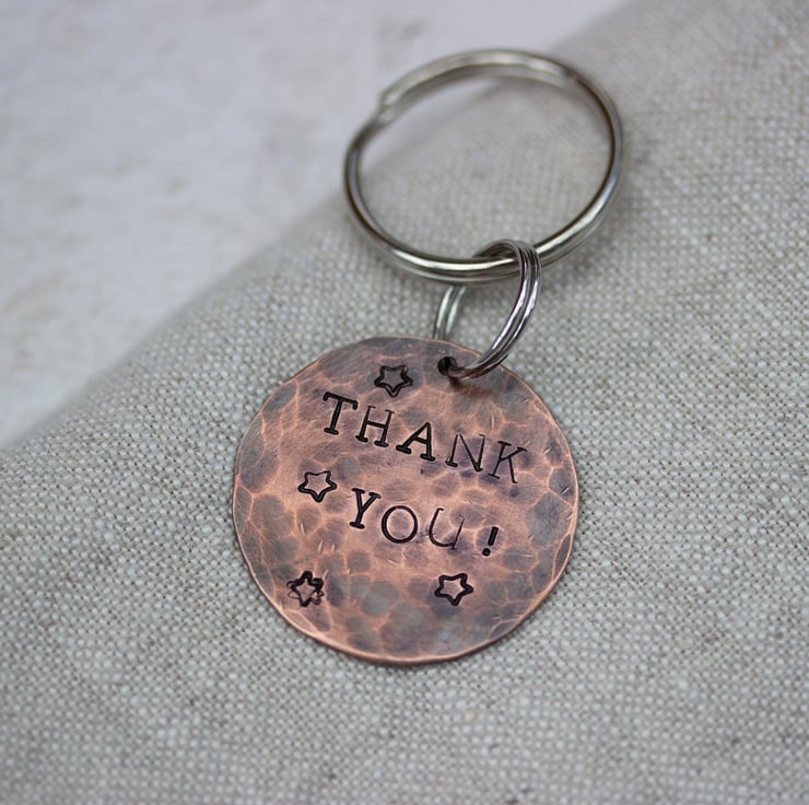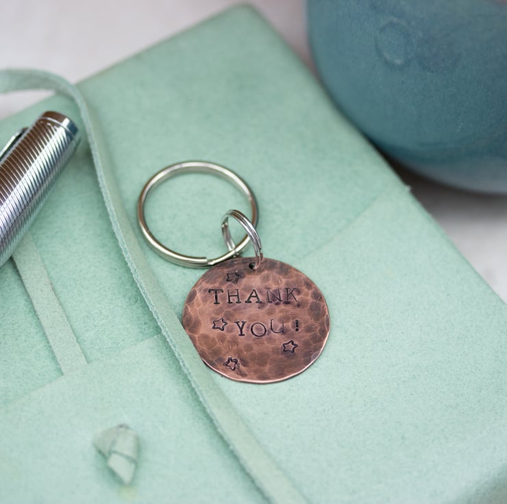 A cute copper keyring which has been hand stamped with a 'thank you' message and some pretty little stars.