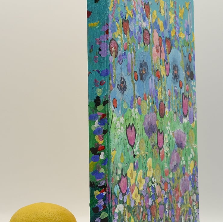 I've called this modern piece, "In & Out of the Blue" in celebration of all the vivid blue flowers that pepper the Scottish Highlands. This piece is ready to hang and would make an ideal, colourful gift for any occasion.