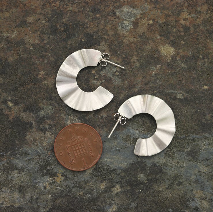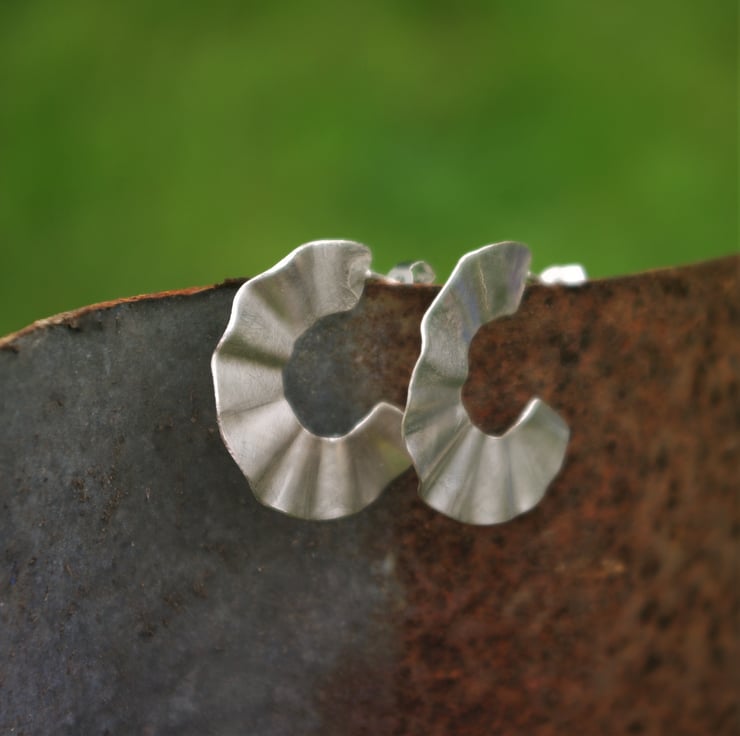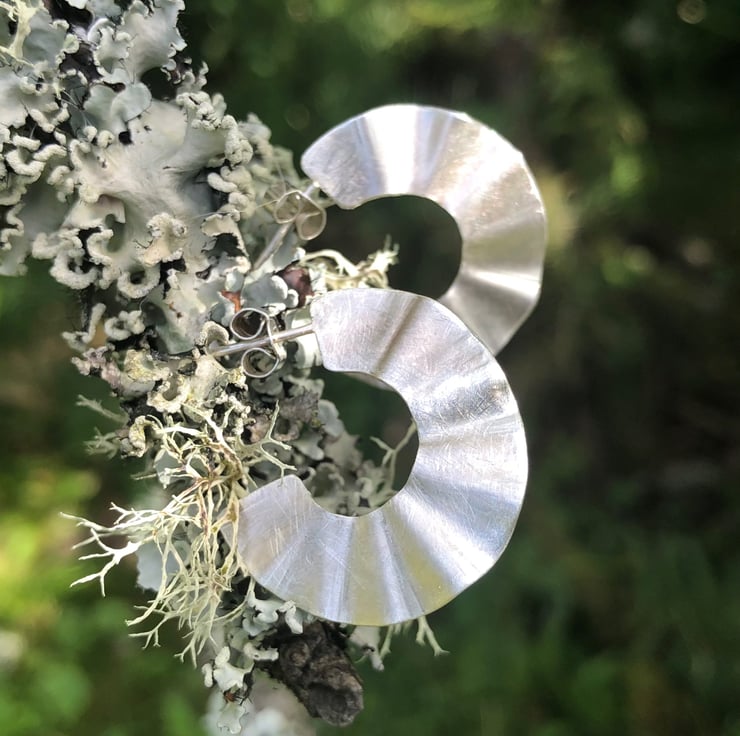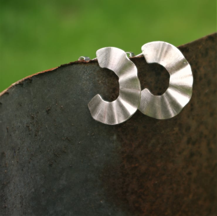 Simple silver circular stud earrings; a twist on a hoop earring . I have cut the circular shapes from flat evo silver sheet and given them a 3D wavy surface , inspired by the ripples of lichen. The diameter is 25mm/one inch , which is the length of the earrings. They are fastened with a sterling silver earpost and scroll back .