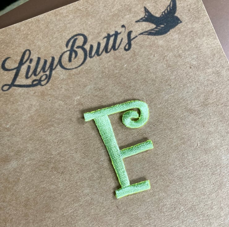 Embroidered Iron on Patch, Letter F, purple and yellow 3cm x 2.3 cm.