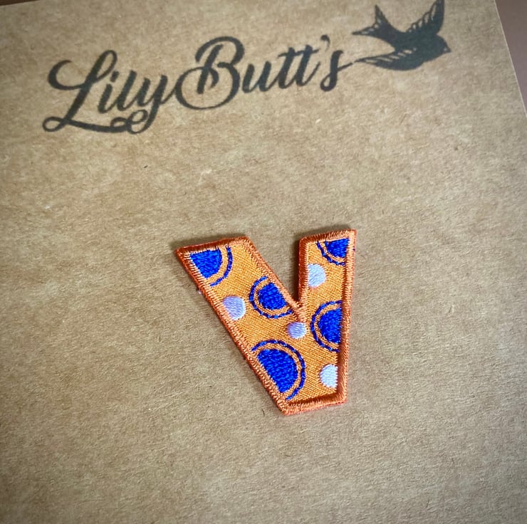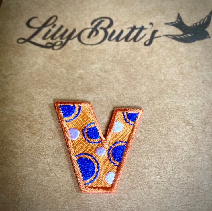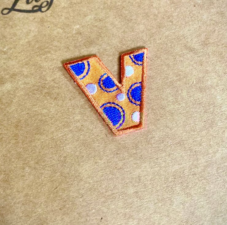 Embroidered Iron on Patch, Letter V, Orange, White, Blue 3cm x 3cm