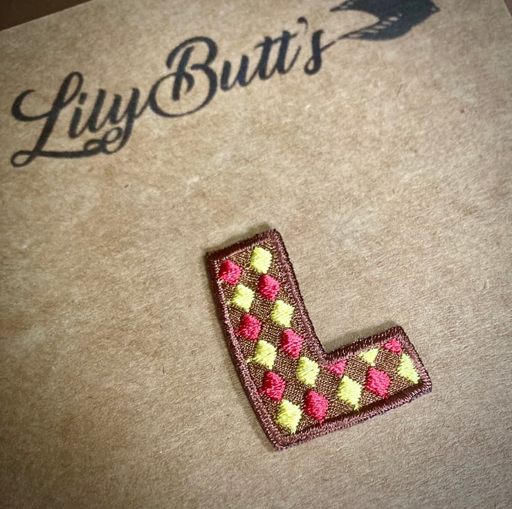 Embroidered Iron on Patch, Letter L, Brown, yellow, red 2.5 cm x 3.5 cm