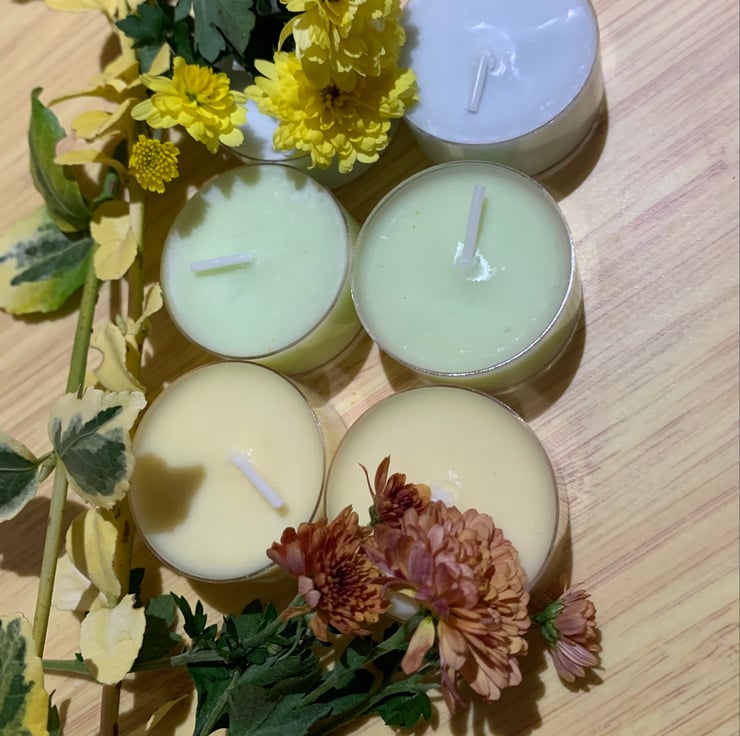 This is a classic citrus blend of bergamot, orange and mandarin essential oil, all top notes. Bergamot and orange are believed to uplift your mood and reduce anxiety or stress, mandarin is thought to help relax and support sleep. Personally, I find these are a sweet summer scent, and make me feel very positive and happy. These tea lights have been dyed yellow.