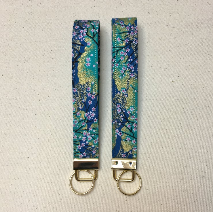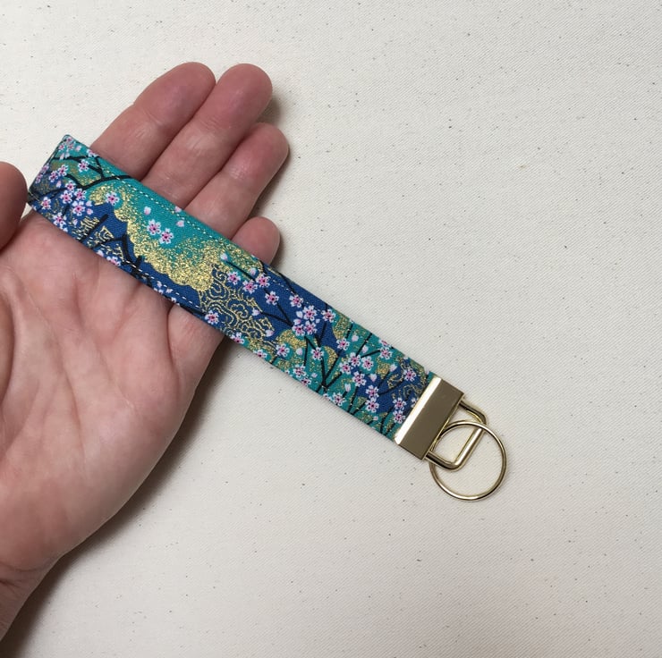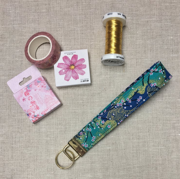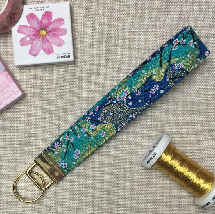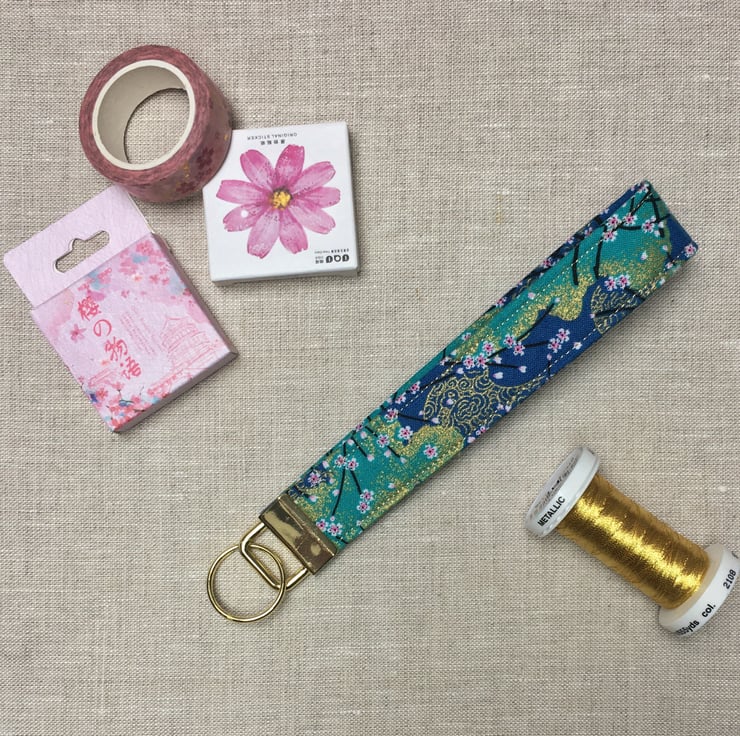 A stunning Japanese fabric with small white and pink blossoms on tree branches with a gold, turquoise and blue background has been used to handcraft this key fob. It has been topstitched with a gold thread to complement the gilded fabric.