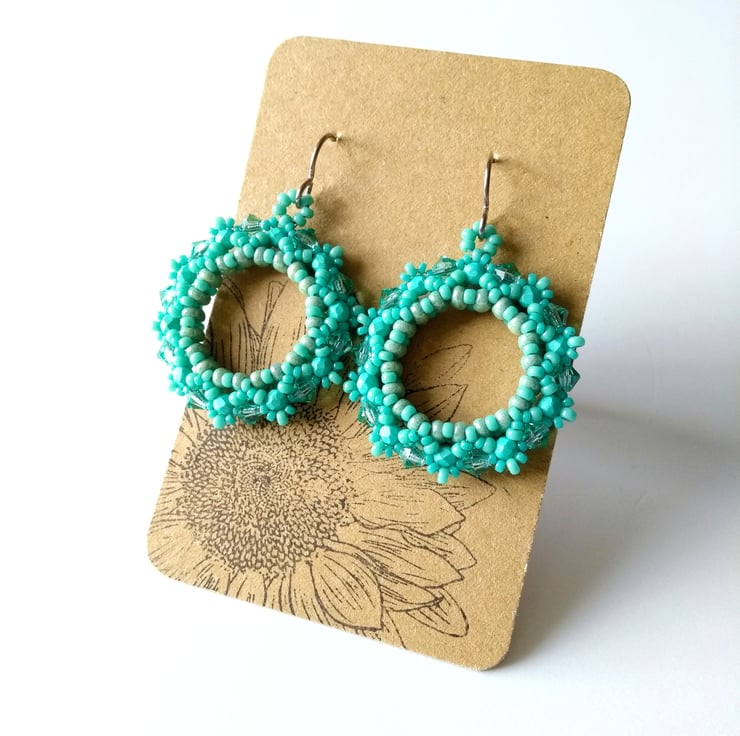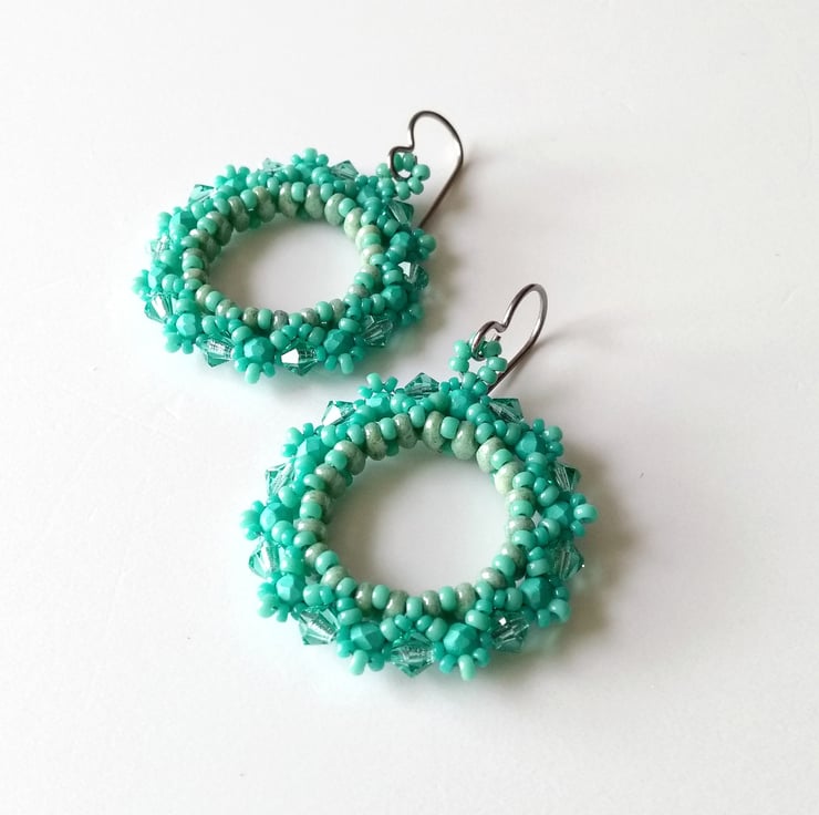 Twin-holed beads have been used to form a solid ring and then embellished with crystals and seed beads. This pair features pretty Preciosa 4 mm crystal bicones in Caribbean Sea - a very pretty and sparkly minty turquoise - plus faceted 3 mm matte turquoise beads together with seed beads also in turquoise. That's a lot of turquoise, I know! They have a lovely beach boho vibe to them, but please don't take them for a swim ...