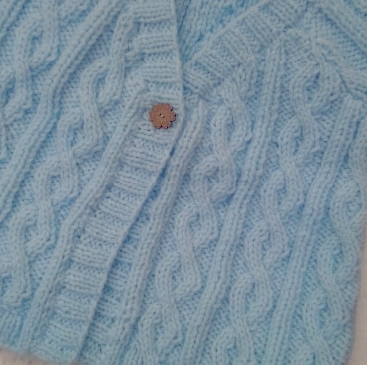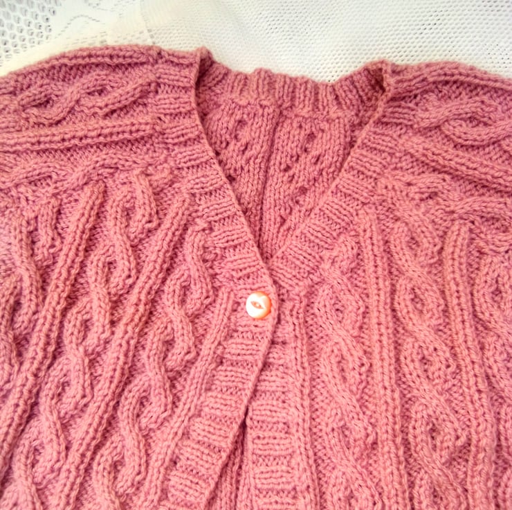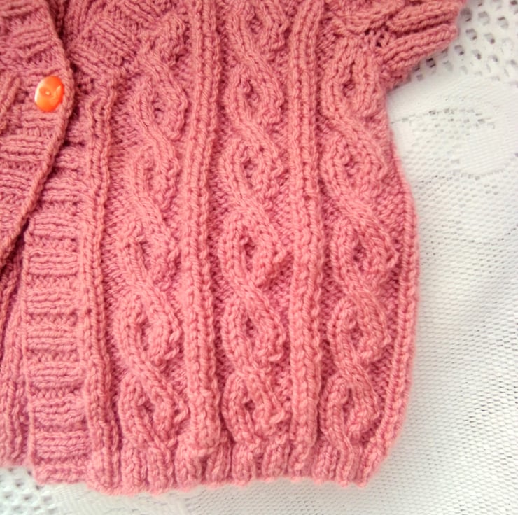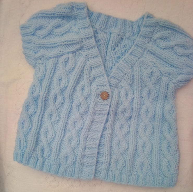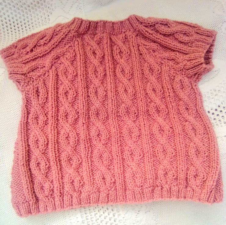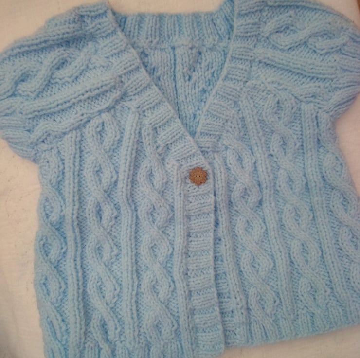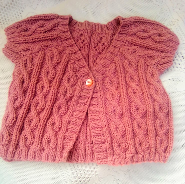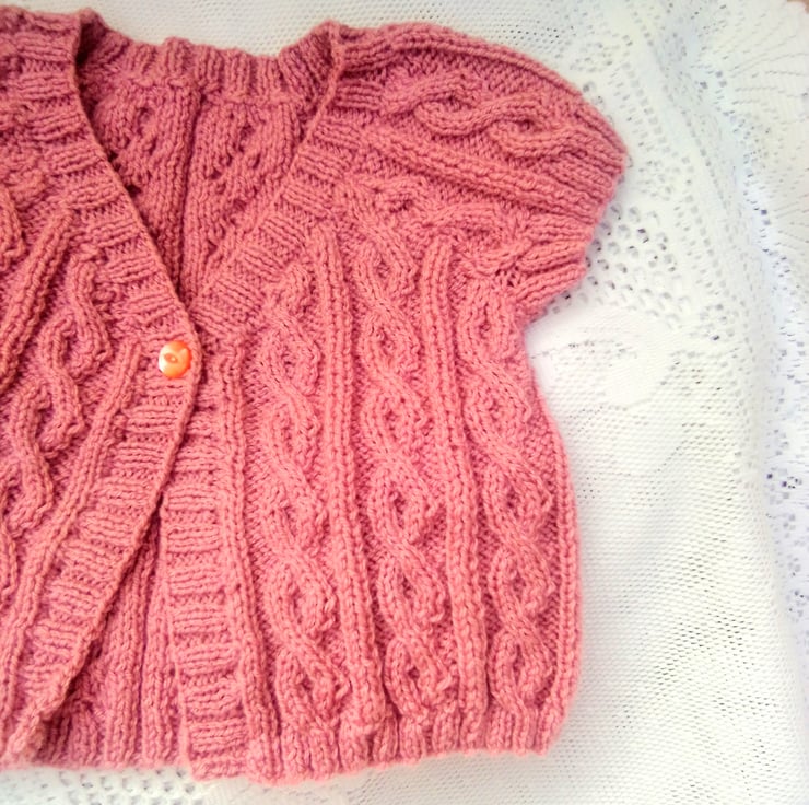 Girls cable pattern cardigan with short cap sleeves and a single button fastening. The cardigan is not in stock but it can be made for you in a colour and size of your choice. Please let me know the colour required when you order. Available sizes are shown at the bottom of this listing. The processing time for this item will be 1 - 2 weeks to produce and post to you.