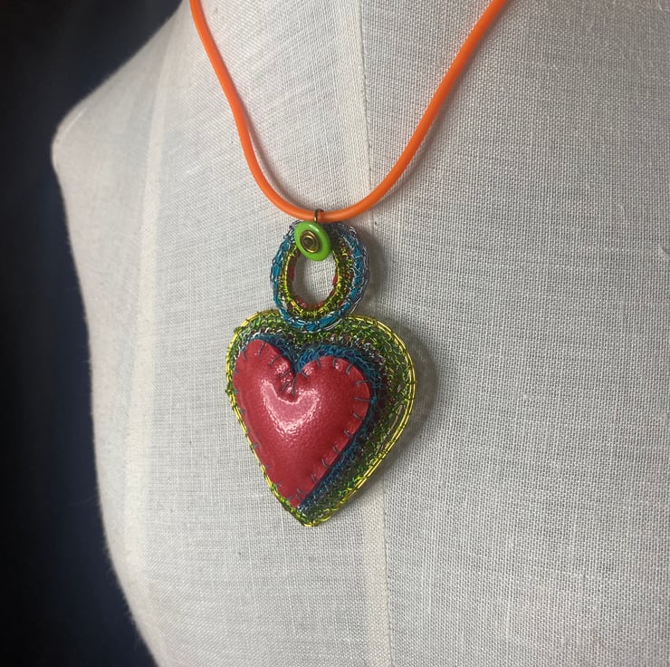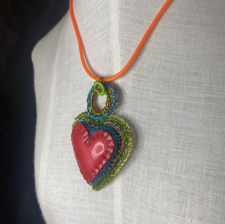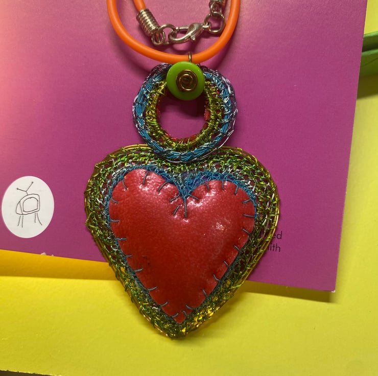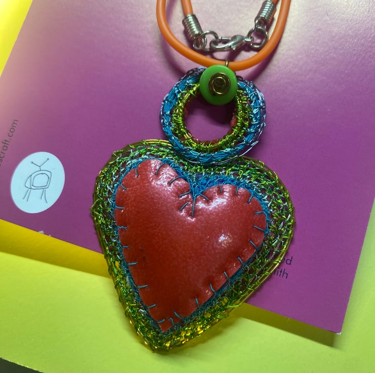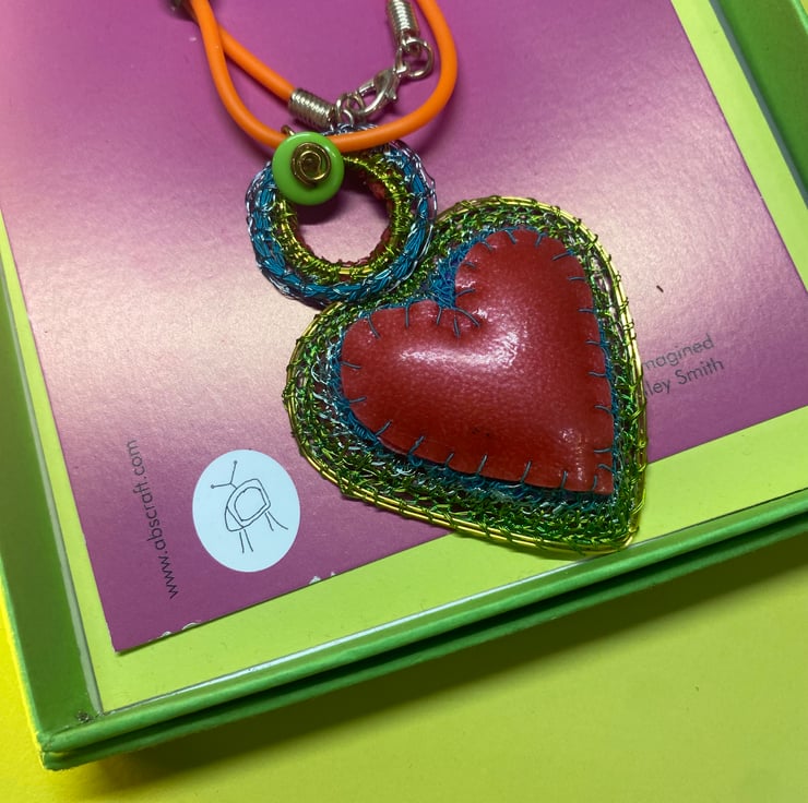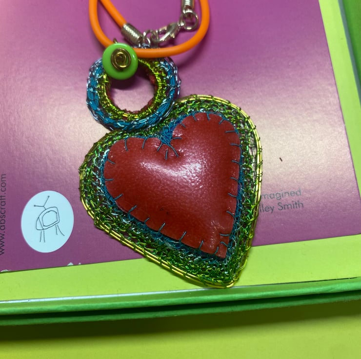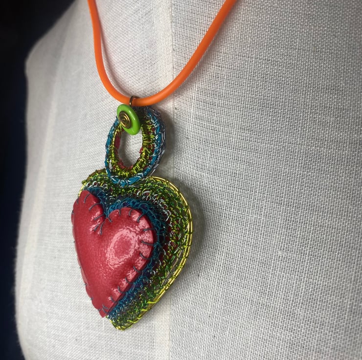 Large red rubber and wire heart pendant from recycled materials by me, Alison Bailey Smith in July 2022. The pendant is light and colourful, with bright joyful rainbow colours. Created by hand using gathered and hoarded materials.