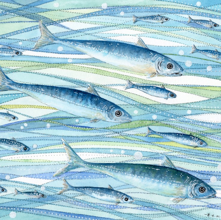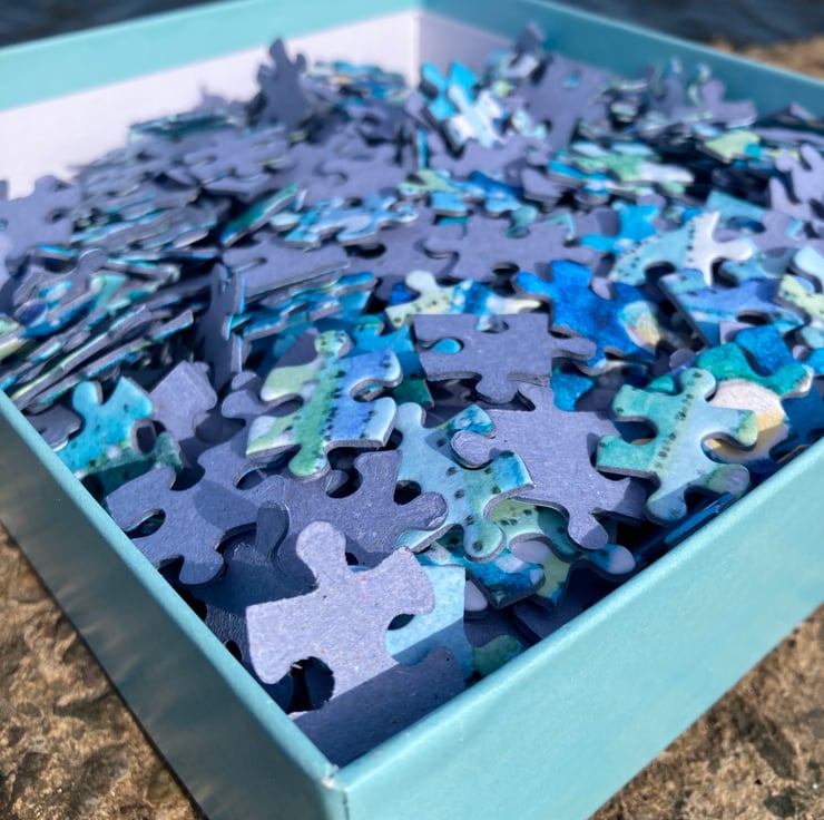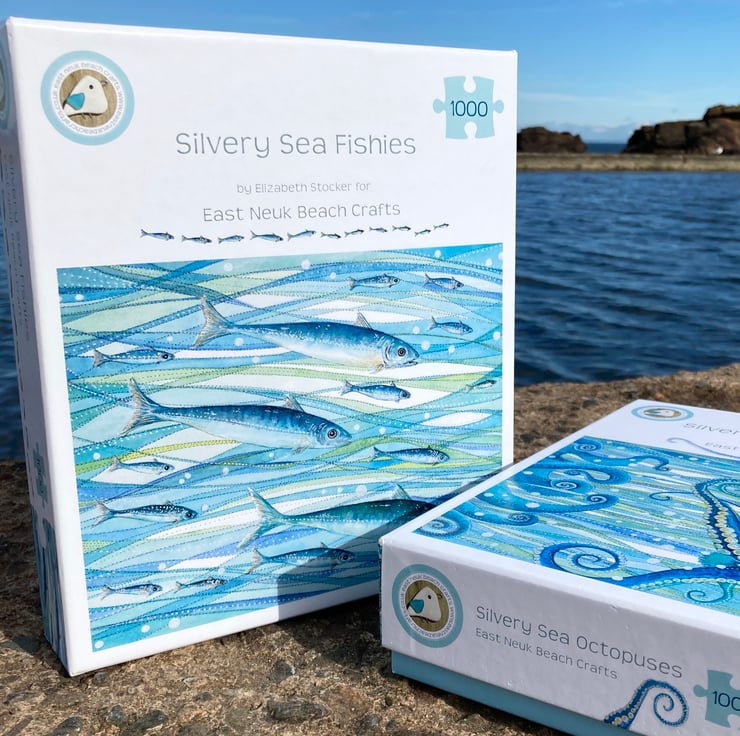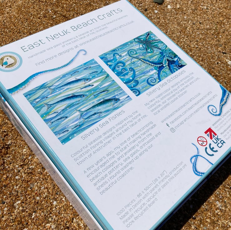 A fish jigsaw puzzle featuring a beautiful underwater watercolour painting. The jigsaw has 1000 pieces and will be a great challenge for any puzzlers. This jigsaw is taken from an original watercolour painting by Elizabeth Stocker (my very talented sister!) and features a gorgeous shoal of fish in a silvery, wavy sea of lovely green and blue hues. The finished jigsaw measures 66cm x 50cm, is manufactured in the UK and made from 100% recycled board. It comes complete with a poster of the design inside, in case you need some extra help! This would be a perfect gift for puzzlers and lovers of the seaside.