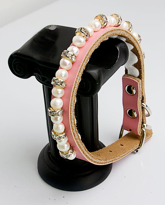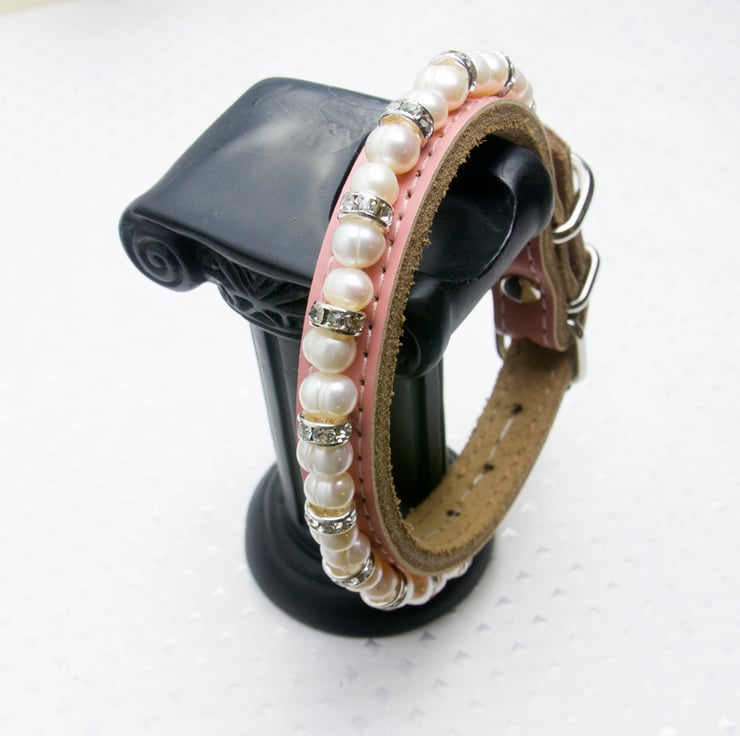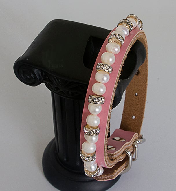 These Unique Luxurious Pink Leather Freshwater Pearl Collars have been designed with Freshwater Pearls interspersed with Silver Rhinestone Beads. Hand sewn and individually knotted onto a Real Leather Collar for your very best friend. The Collar has been lined so it is soft against the skin/fur.