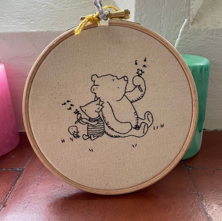 Natural linen fabric, Framed in a wooden hoop which is 5.5 inches high, 5 inches wide and 2.5cm deep. The back of the hoop is backed with felt. Pooh bear and Piglet are hand embroidered with DMC thread.