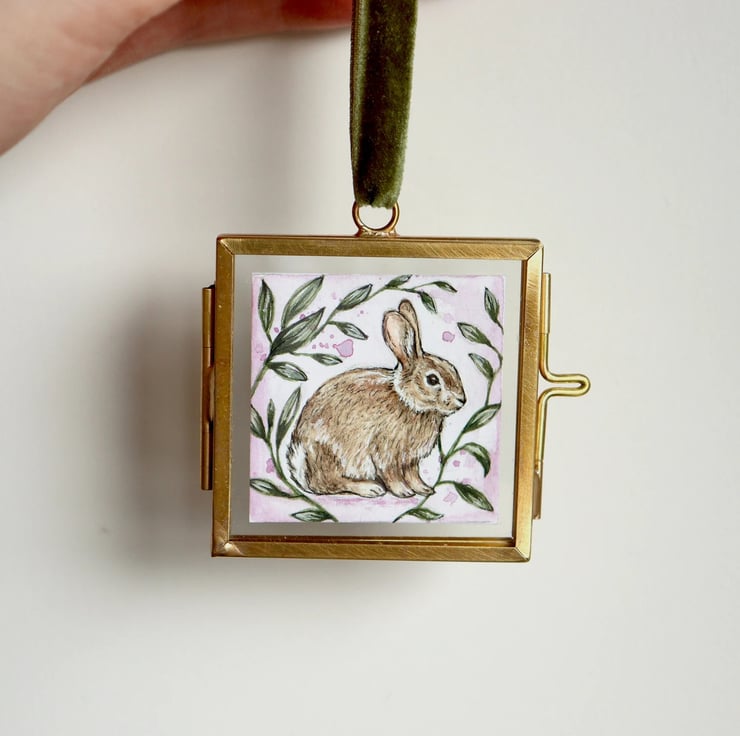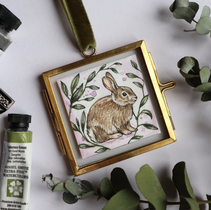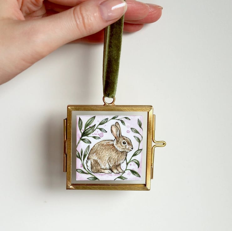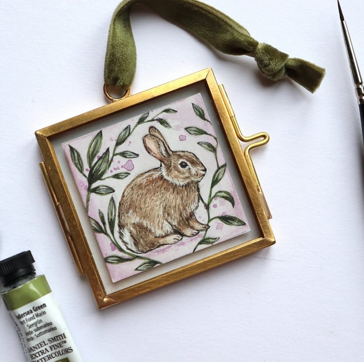 The painting itself measures approx. 4x4cm", and the brass/glass frame measures 2x2" and hangs with an olive green velvet ribbon.