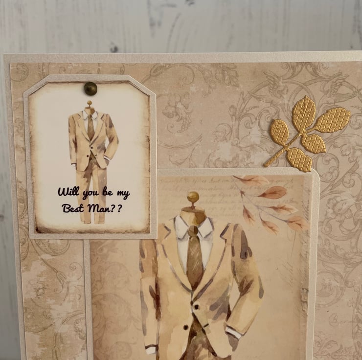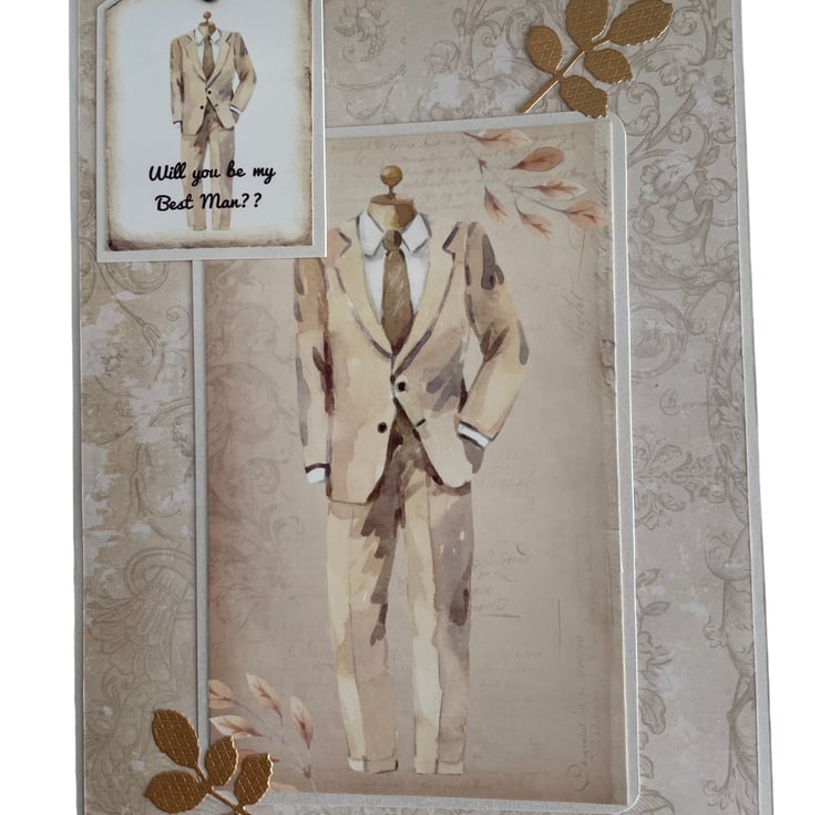 Vintage style card in muted tones. Pearl card and envelope. Bridal suit on the front, leaves and a tag reading ‘Will you be my Best man’