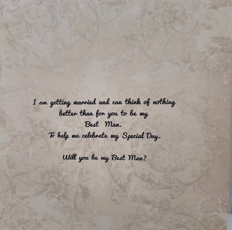 Inner sleeve in a muted scroll design reads: I am getting married and can think of nothing better than you to be my Best Man. To help me celebrate my Special Day. Will you be my Best Man?