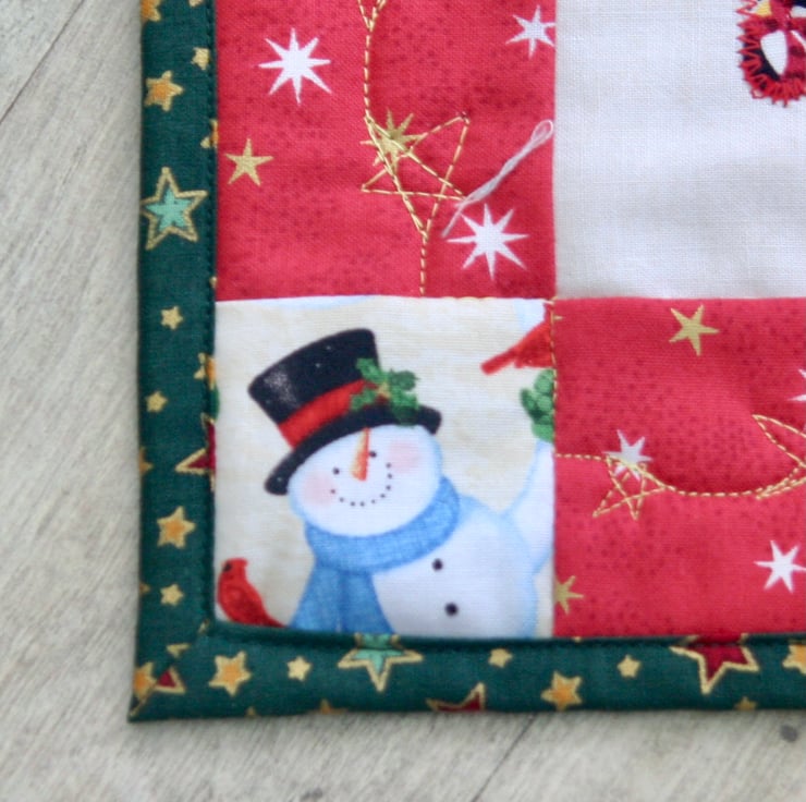 A personalised Christmas placemat designed to the customers specifications, with a name across the centre with Snowmen on a beige fabric and stars on red fabric around the edges.