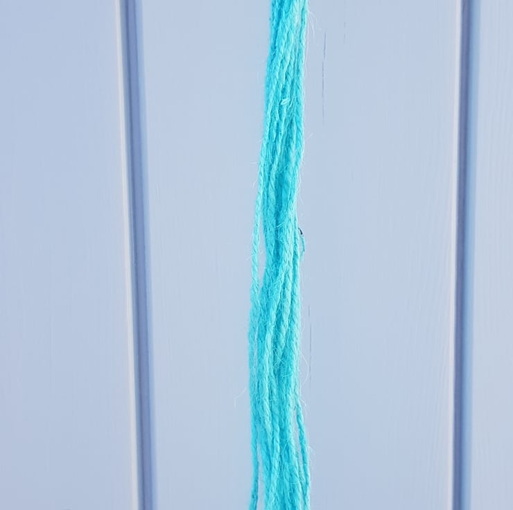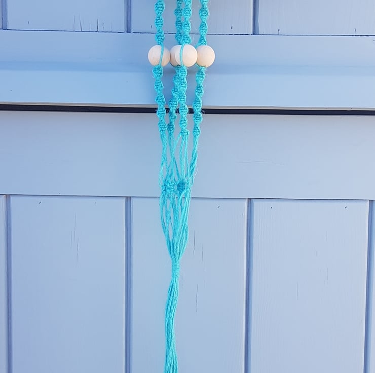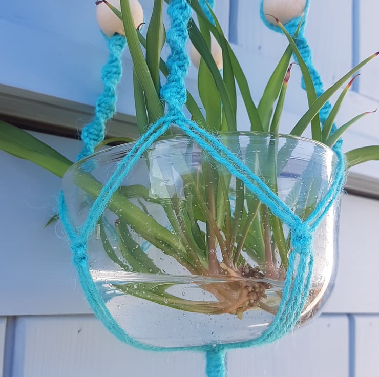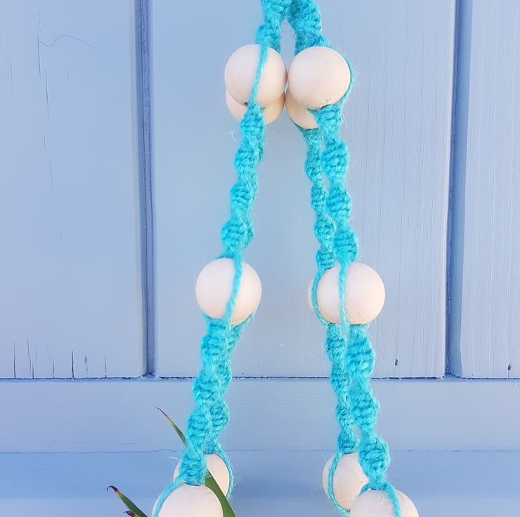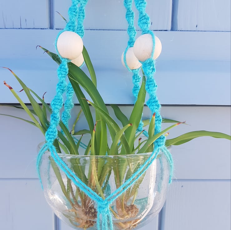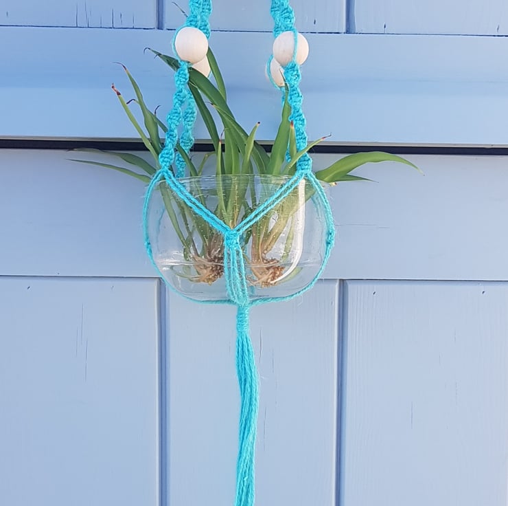 A vibrant handmade hanging basket, made using 100% pure jute cord in turquoise, with natural wooden beads and a natural wooden ring to hang the basket from.