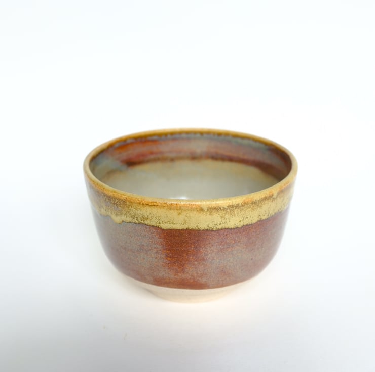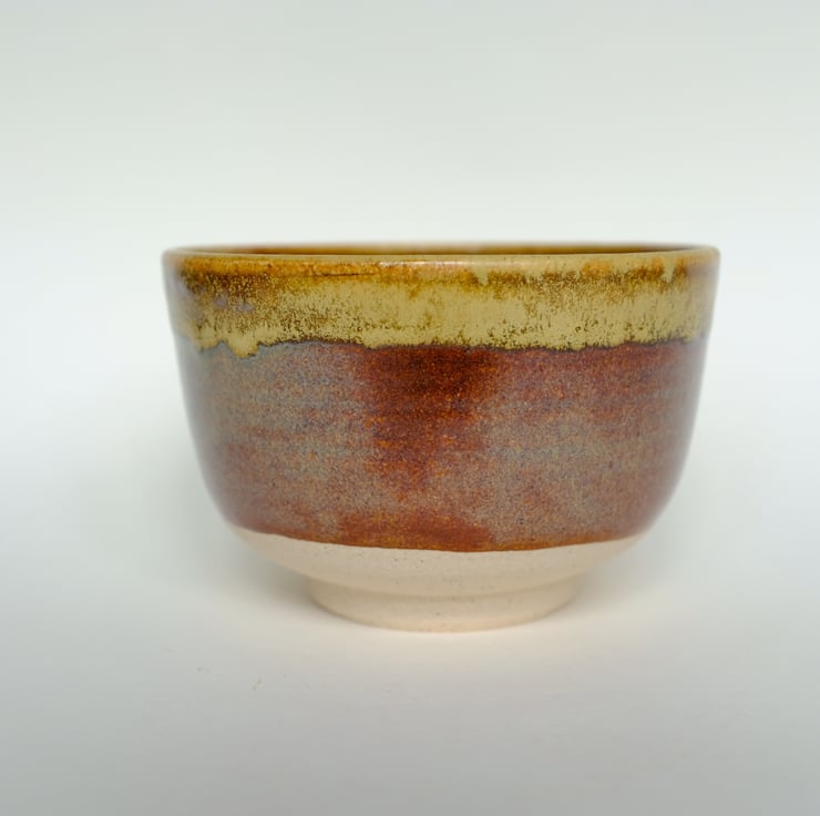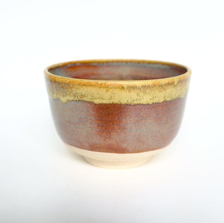 Hand thrown stoneware tea bowl (chawan). Greeny-brown with mustard rim.