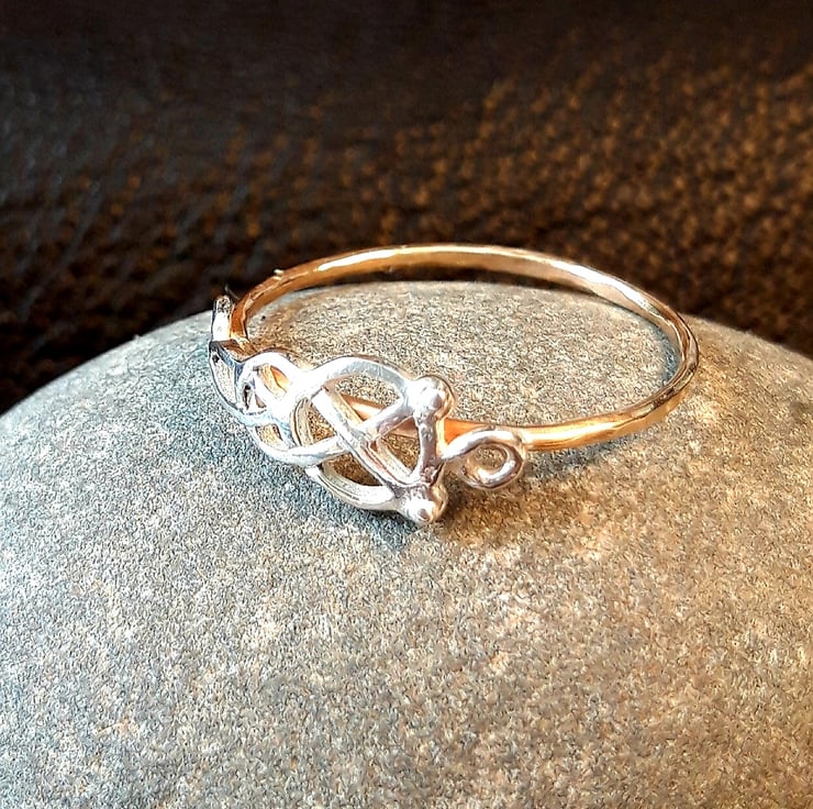 This ring started life as a delicate silver knotwork earring. Having lost its twin it has been repurposed into a gorgeous little ring. The band is made from rolled gold, or bonded gold - a much thicker and more durable alterative to gold plating. It is a lovely shiny contrast to the silver knotwork.