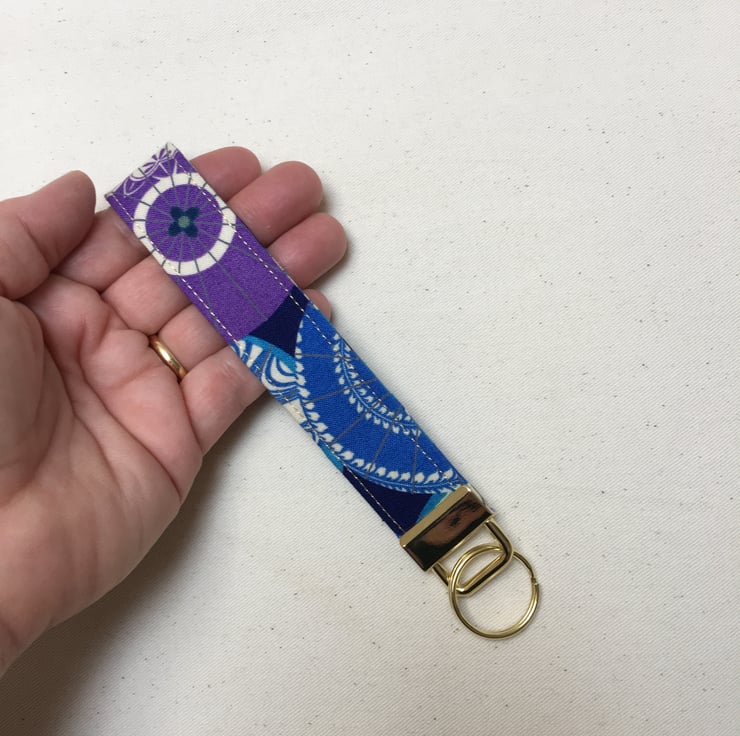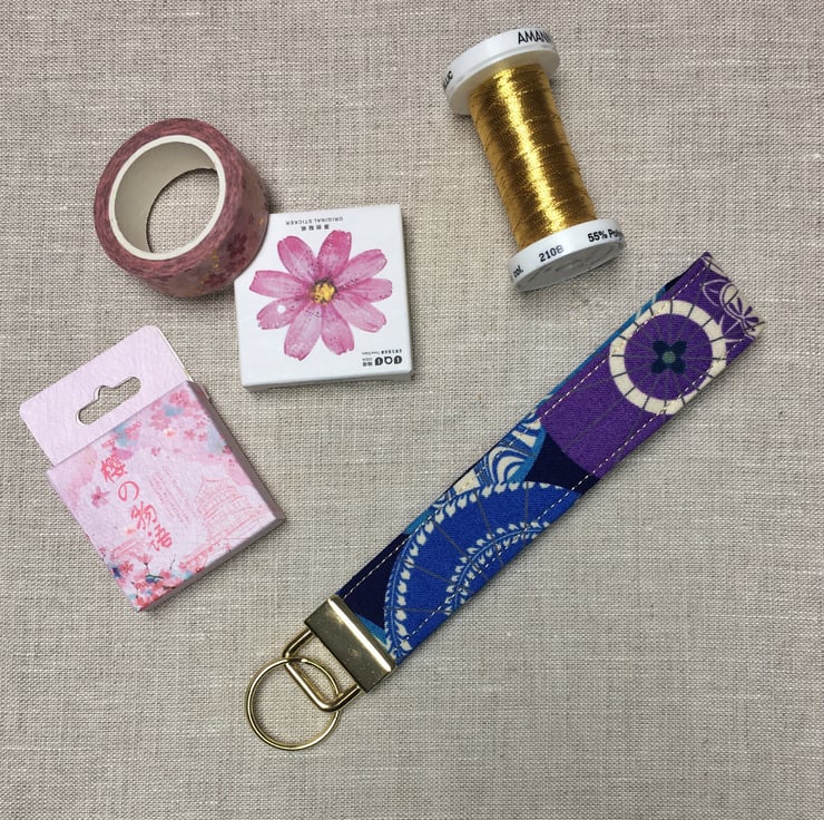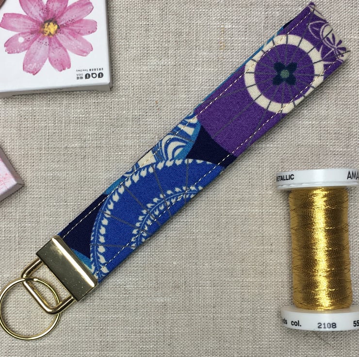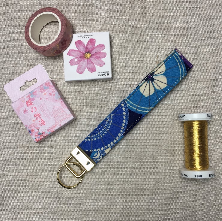 A contemporary Japanese fabric depicting umbrellas or parasol in blues, purple and cream has been selected for this handcrafted key fob.