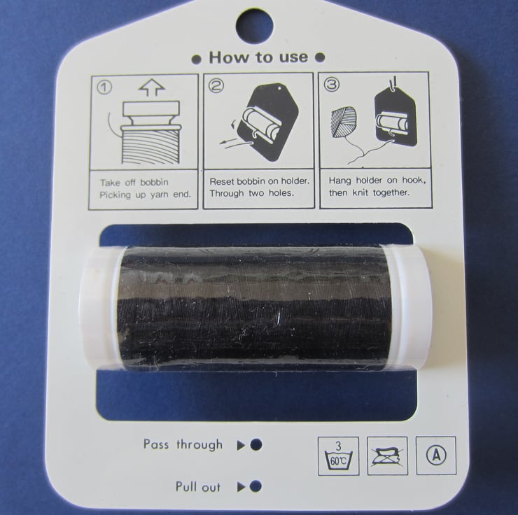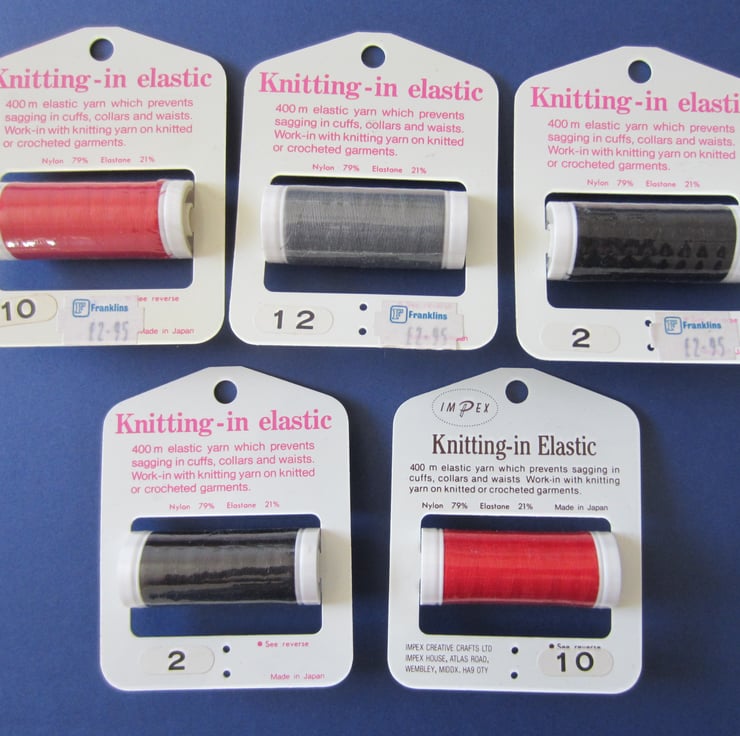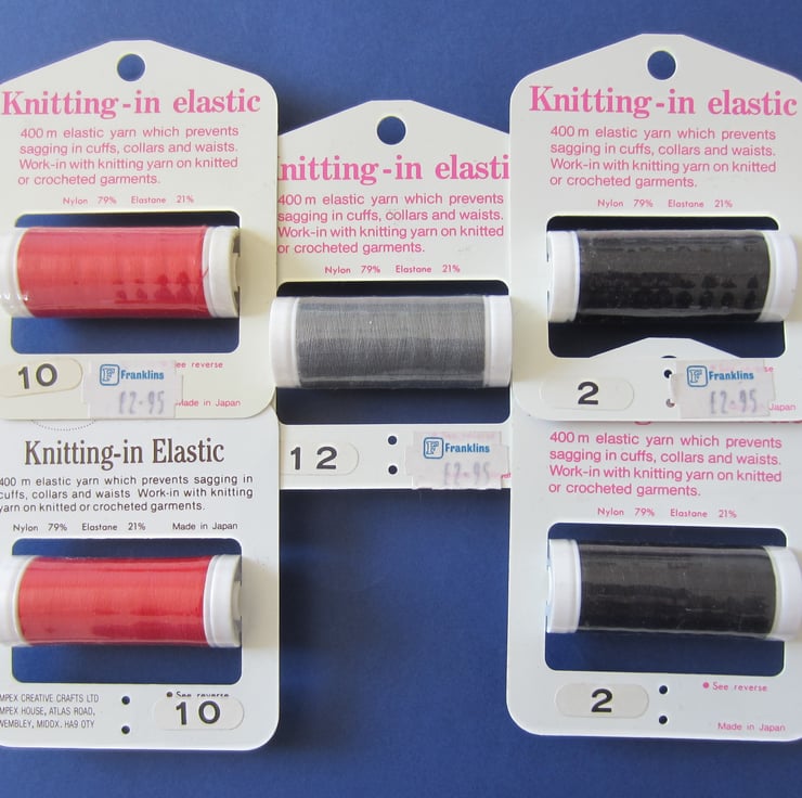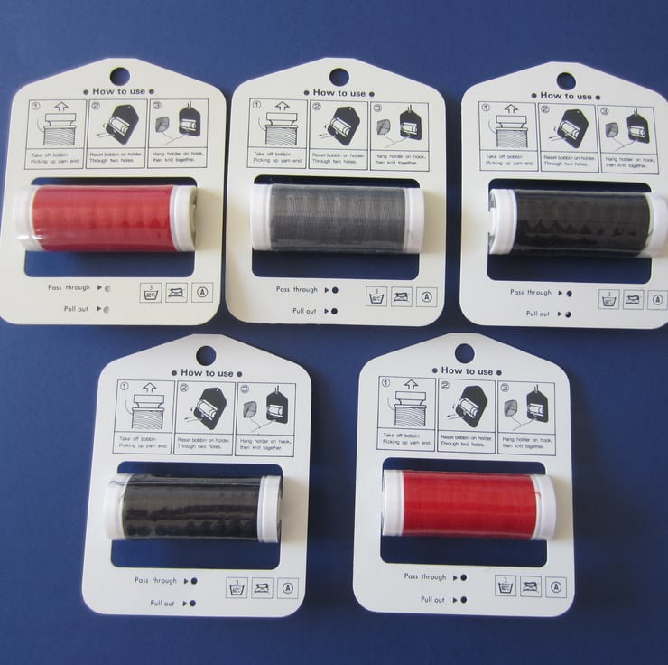 5 reels of knitting-in elastic, on original cards and with cellophane around each reel. There are 2 reels of red, 2 reels of black and 1 grey. There is 400 m on each reel. Instructions for use are on the back of each card.