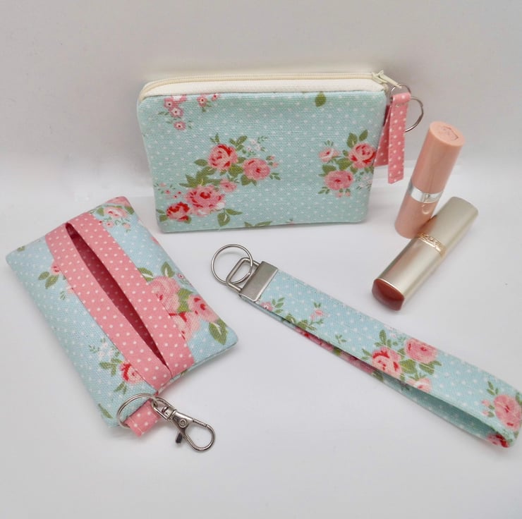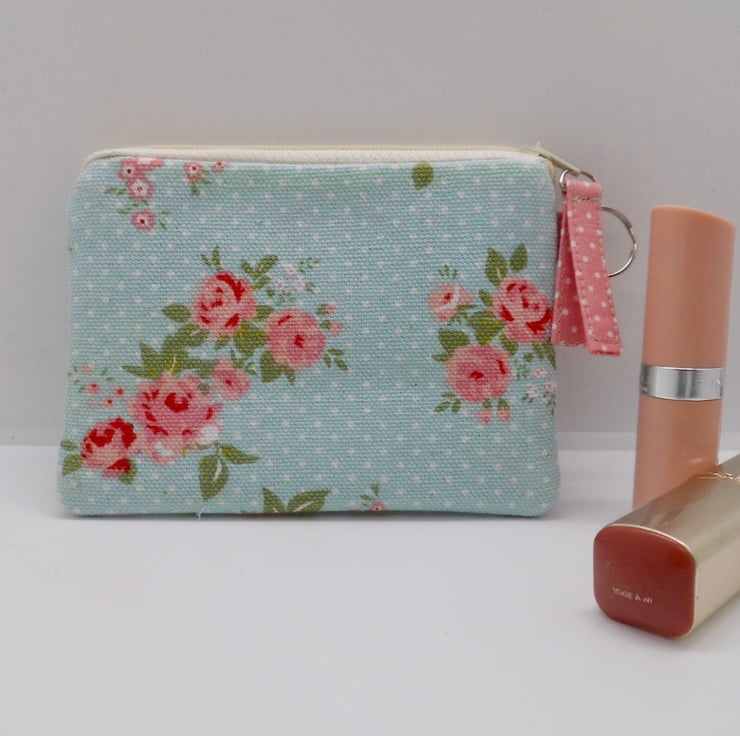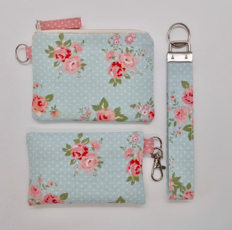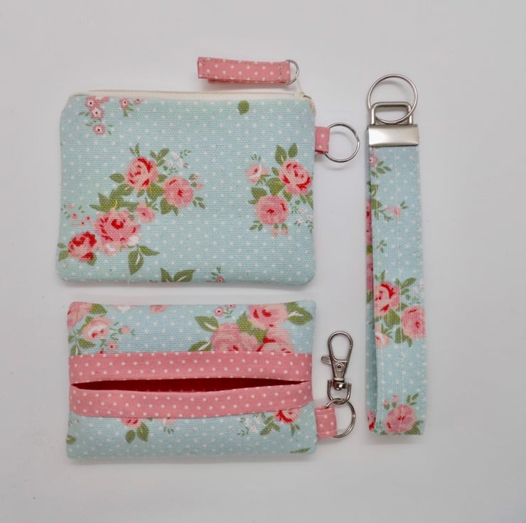 Firstly we have a pouch which I designed to keep a packet of tissues neat and tidy and clipped somewhere handy on your keyring or in your bag. Made using a very pretty blue furnishing weight cotton with a vintage style print of pink roses. The fabric is backed with fusible interfacing to give it some body and maintain shape. Fully lined with a pink and white spotty fabric and includes a handy lobster clasp.