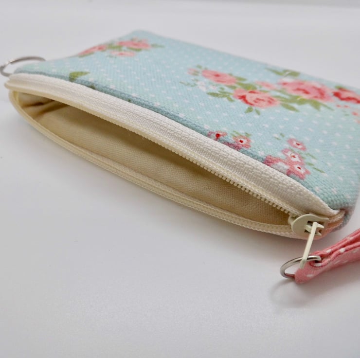 And lastly we have a matching coin purse, or perhaps a mini make up bag. Measures 13cm x 3cm and lined with ivory coloured cotton fabric. It has an ivory zip and a keyring inserted into one of the side seams, handy for clipping inside your bag, or to one of the other items.