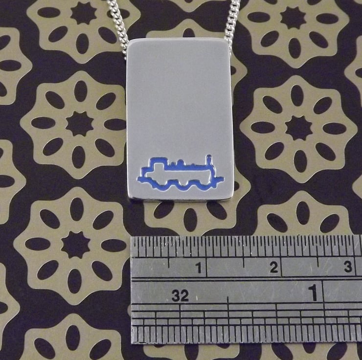 This steam engine pendant has been lovingly handcrafted in Shropshire. It is made from recycled sterling silver and is etched before being cut by hand, the edges are then smoothed using files and emery paper. Two pieces of 1mm wire are attached to the rear to hold the chain. A coloured resin based enamel is added to the etched area and the piece is then polished before being attached to a chain.