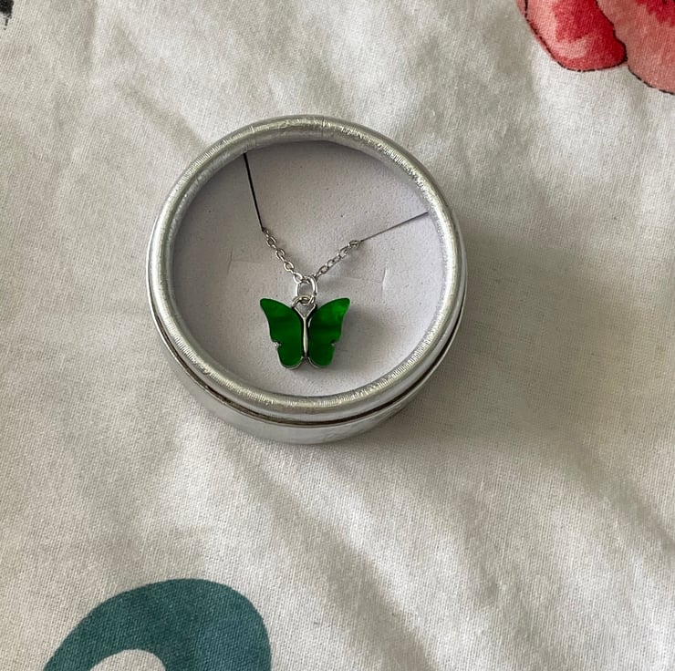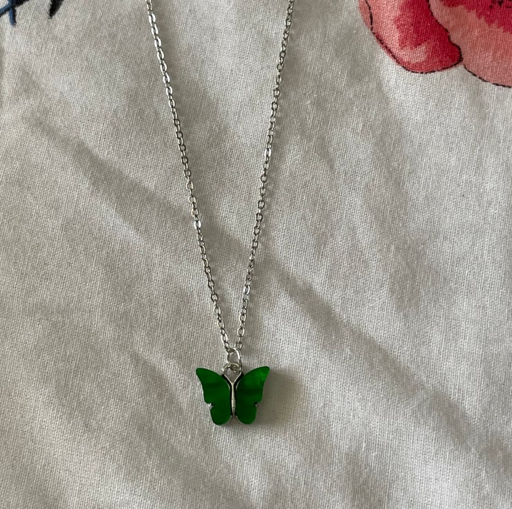 Gorgeous silver chain with a dainty bright green butterfly charm.