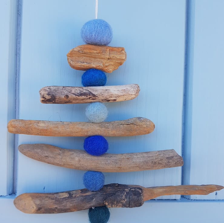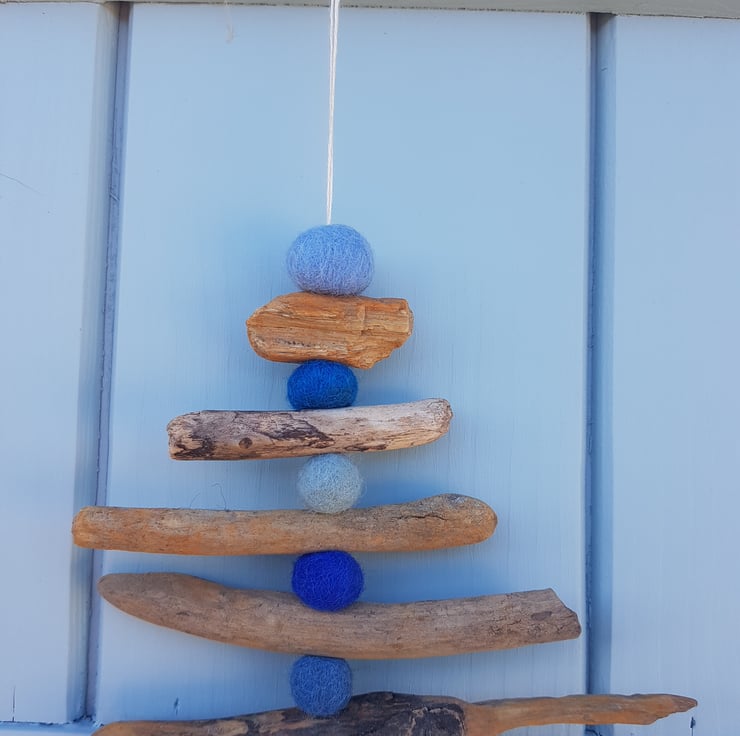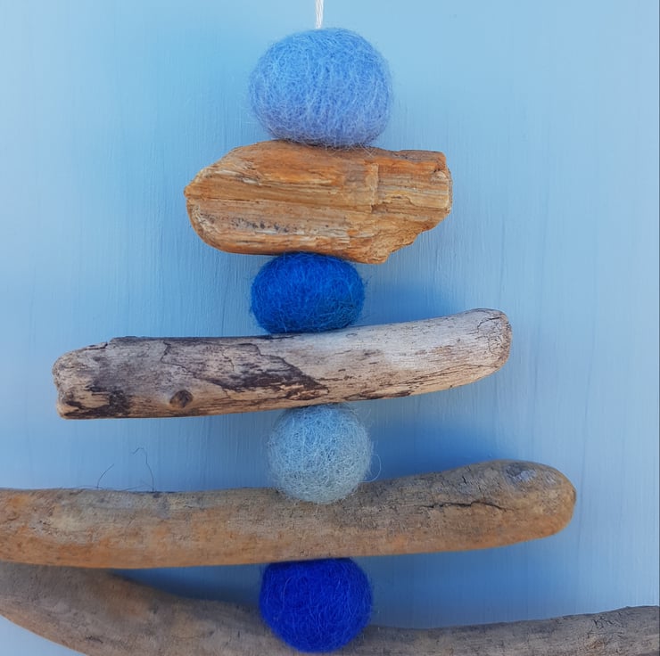A handmade hanging tree decoration. Made from driftwood, handmade wet felted coloured wool balls and natural cotton twine.
