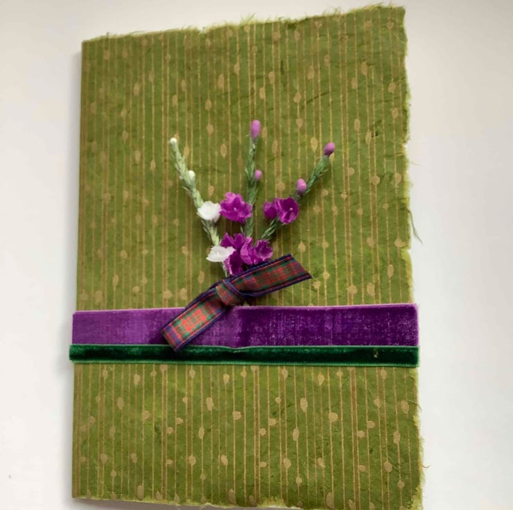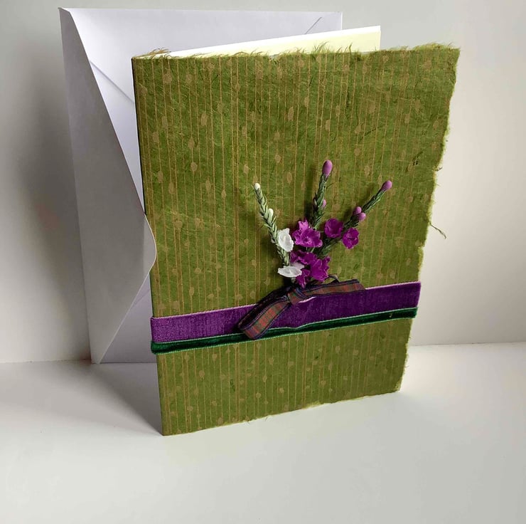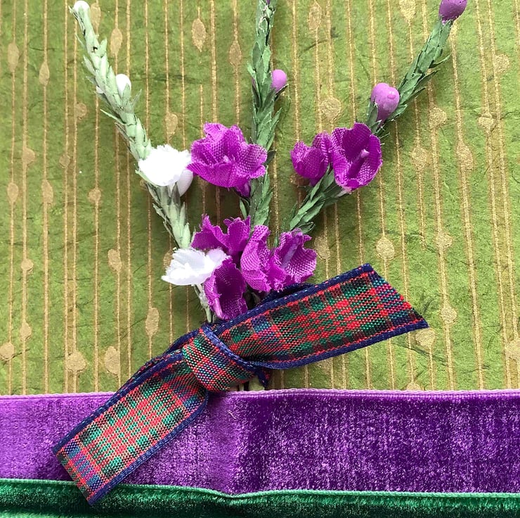 Below the middle there are 2 velvet ribbons (one purple and one green) and behind that are 3heather sprigs (one white and 2 purple) they are tied together with a thin tartan ribbon