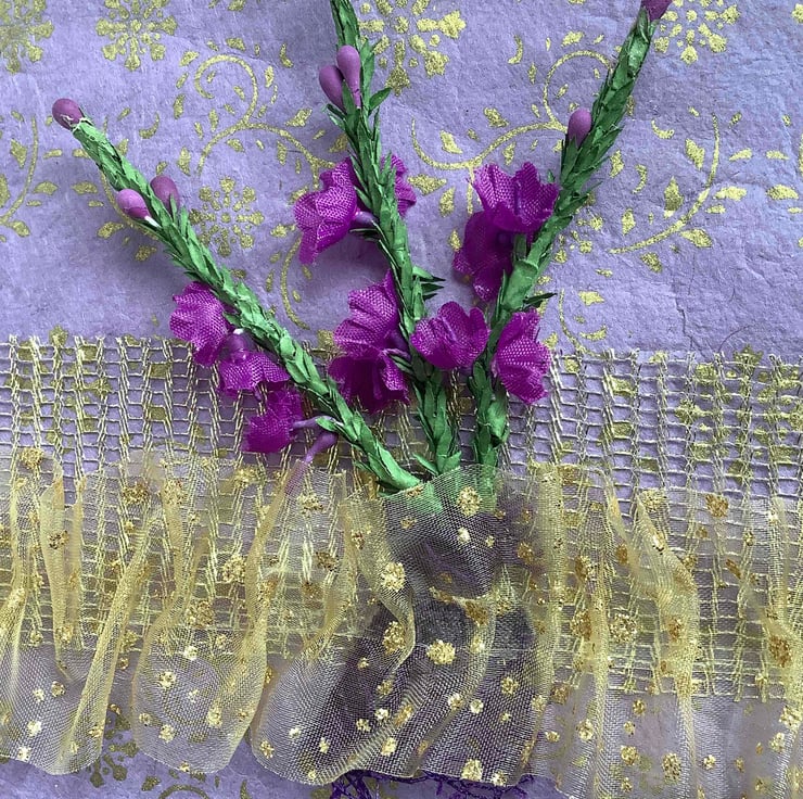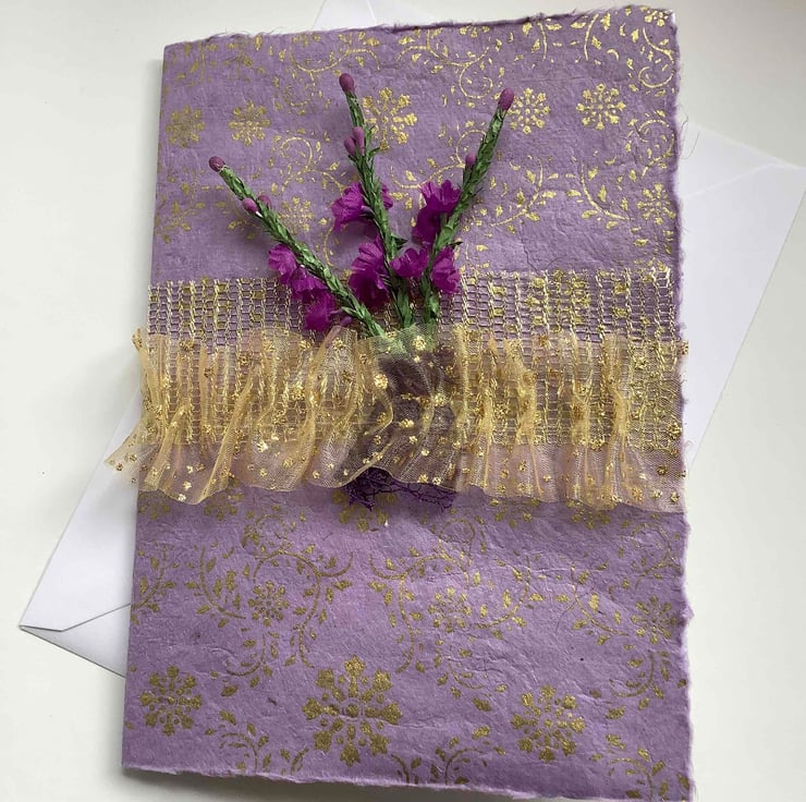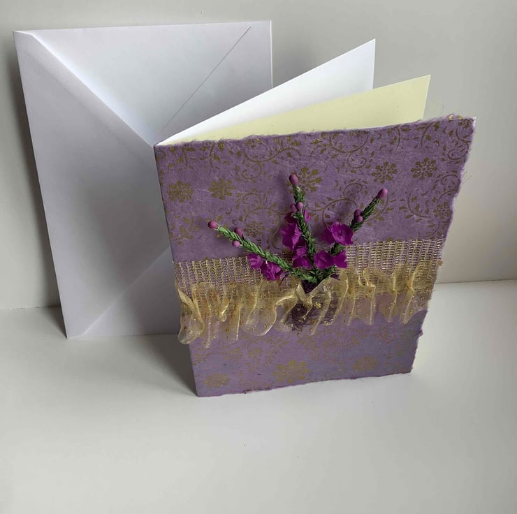 The 3 purple heather sprigs are wrapped around by a dark purple net braid and lie on top of a gold net braid. There is a ruffled gold spot sparkly ribbon ruffled across the front of the card to finish it off.