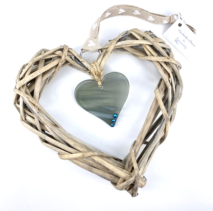 Fused Glass & Wicker Hanging Heart - Wispy Grey
