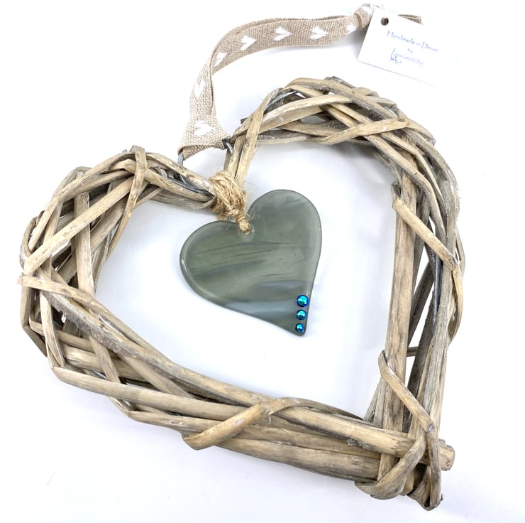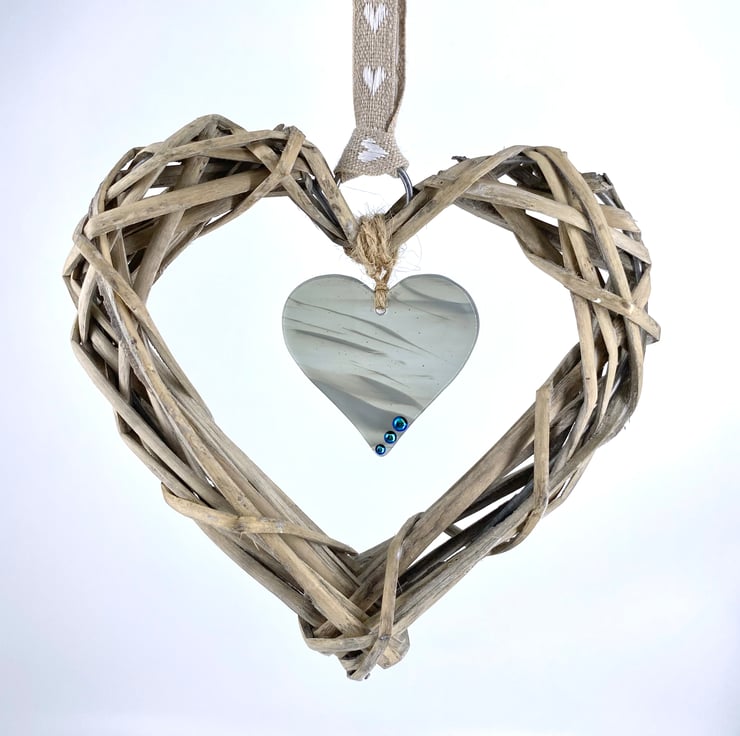 Fused Glass & Wicker Hanging Heart -  Wispy Grey