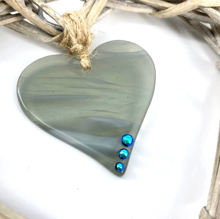A gorgeous heart made from wispy grey art glass with 3 sparkly dichroic teal beads fused at the tip.