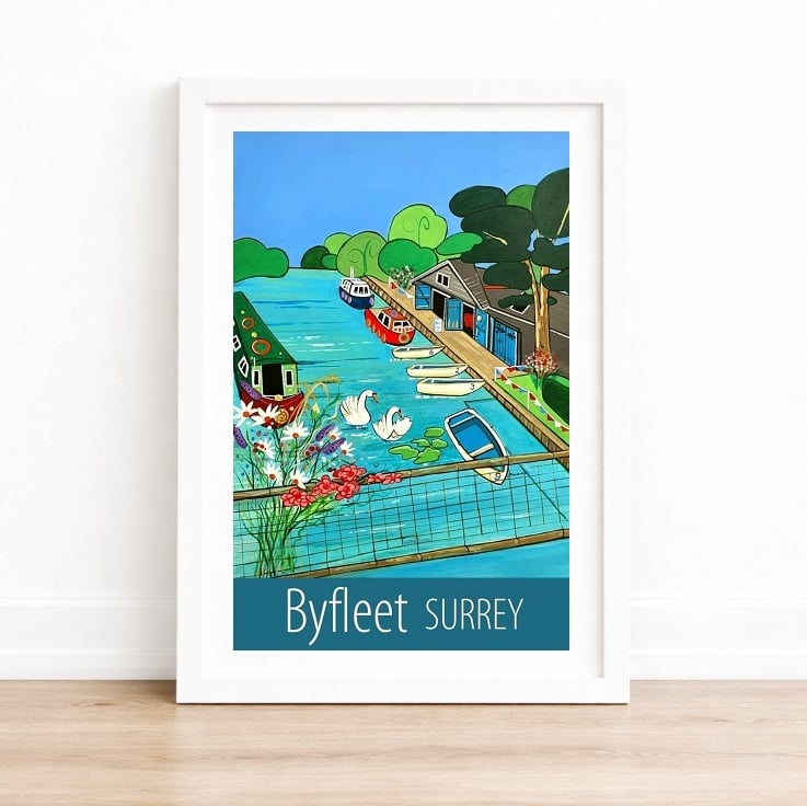 A contemporary travel poster style print of the River Wey and boat shed by Parvis Wharf in Byfleet, Surrey, from my own original acrylic painting. A perfect gift for those who love Byfleet!