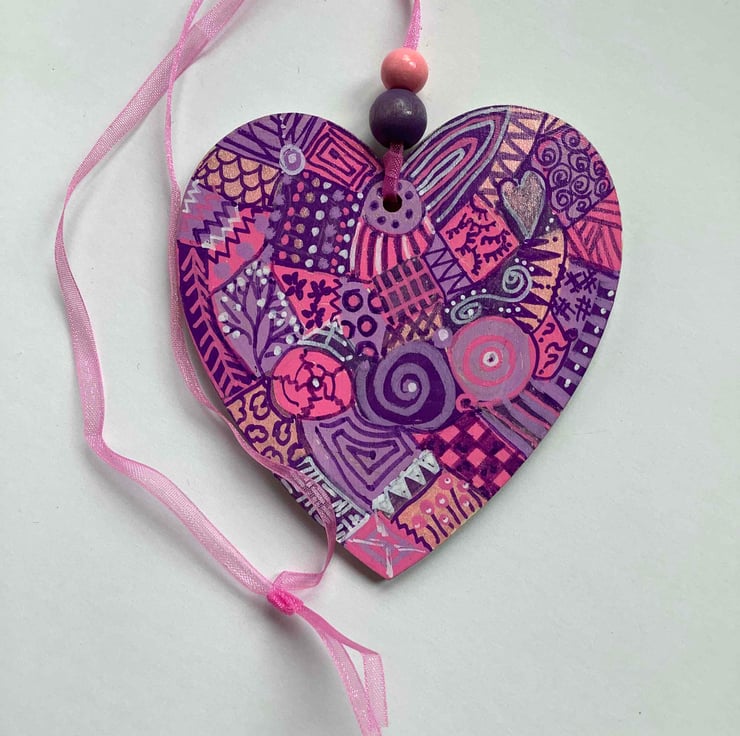 Both sides of this wooden heart are painted in a mix of colours which consists of pinks, white, purple and lilac