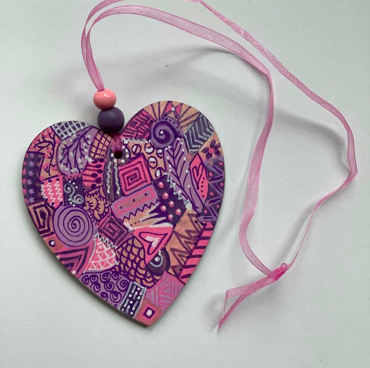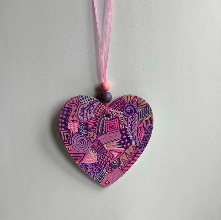This hearts hangs by a fine pink organza ribbon attaching 2 wooden beads (purple and pink) which can be removed