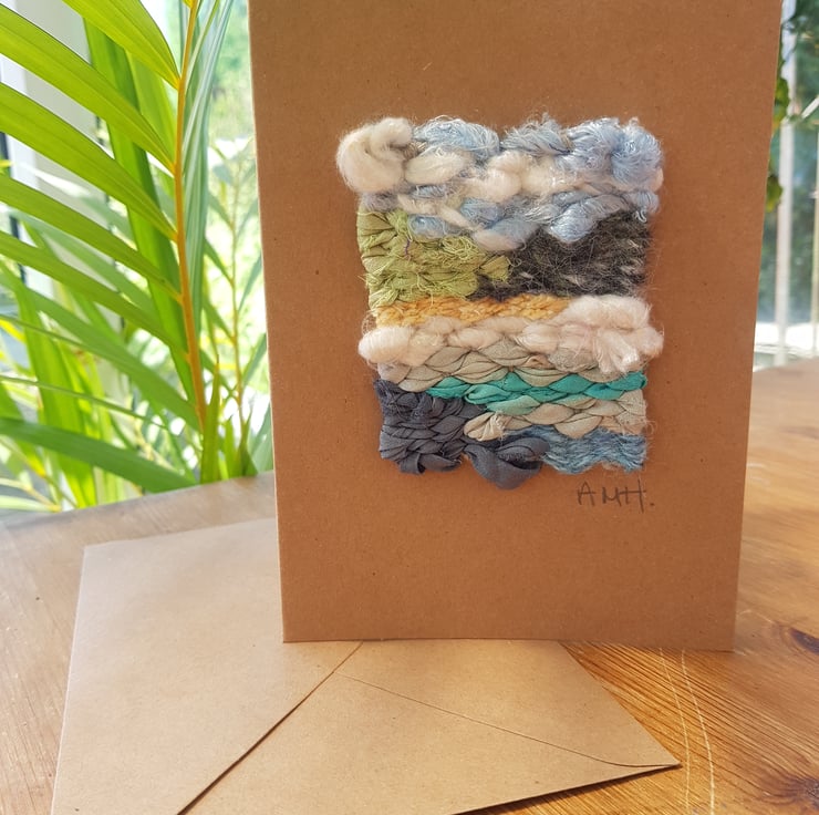 Individually designed handmade card with a 'mini' weaving that has been hand woven using natural wool fibres, pure cotton cord and recycled silk fabric, mounted on a buff card.