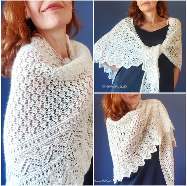This delicate lace pattern shawl is MADE TO ORDER and available in many colours. Pictured shawl is made in colour 1101 White and 9021 Fog.