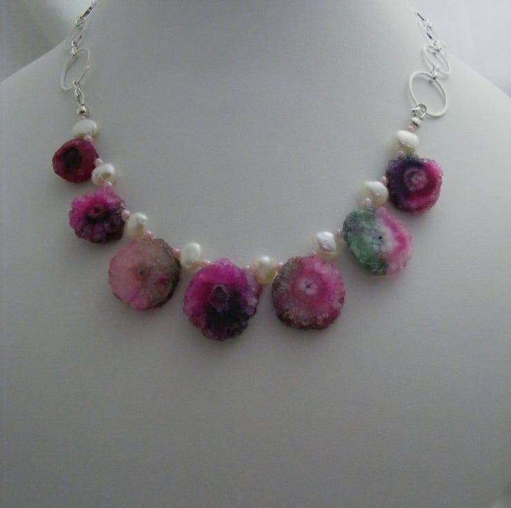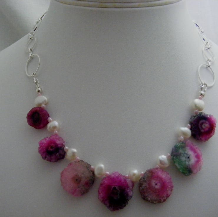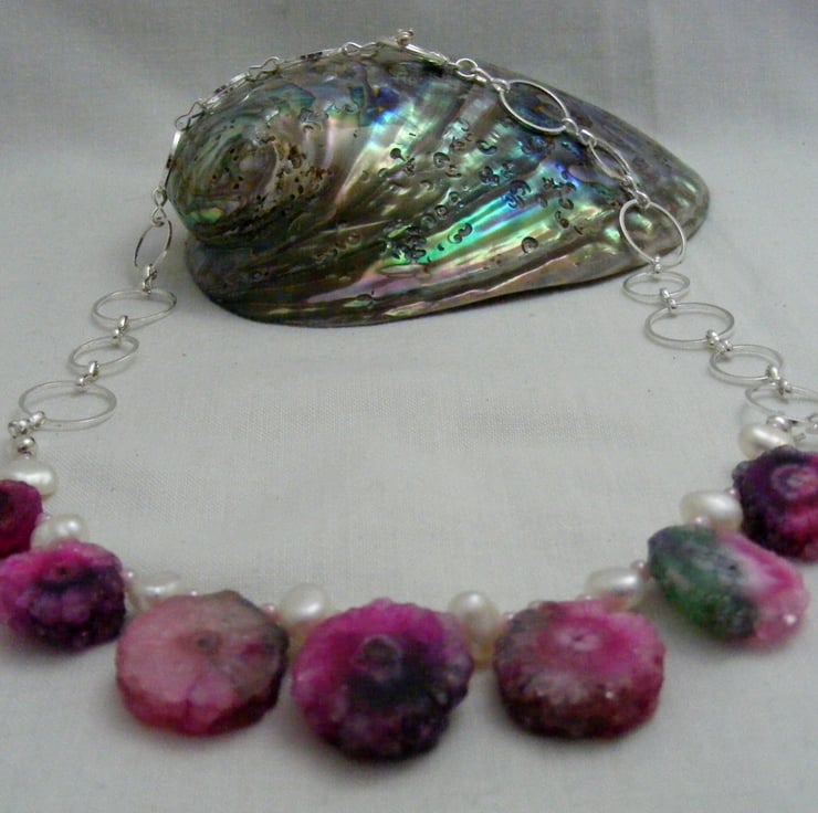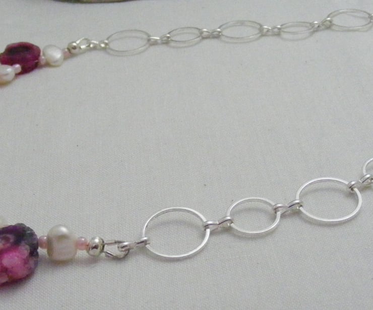 This beautiful gemstone necklace is handmade with, solar quartz irregular round gemstones with the largest quartz 18mm and the smallest quartz 12mm, 9x5mm white freshwater pearls, pale pink seed beads, silver plated findings, silver plated round link chain and a silver plated toggle clasp.