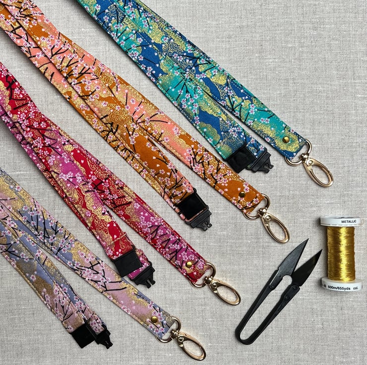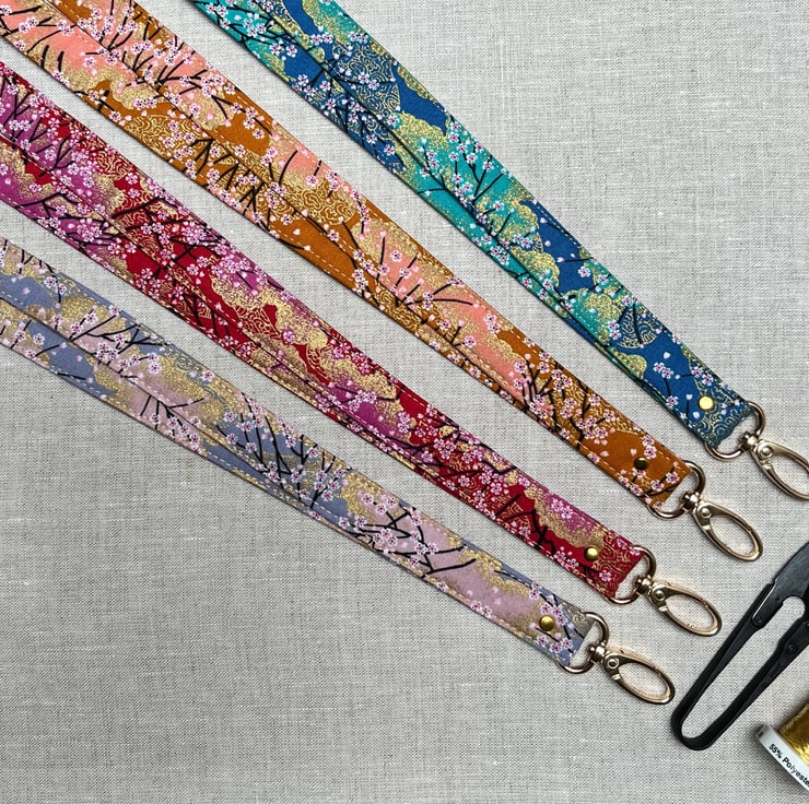 These fashionable lanyards have been hand crafted from a pretty Japanese fabric with small white and pink blossoms on black tree branches and a coloured background. It has been topstitched with a gold coloured thread to compliment the gilded fabric.