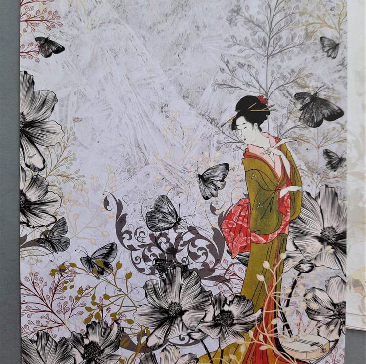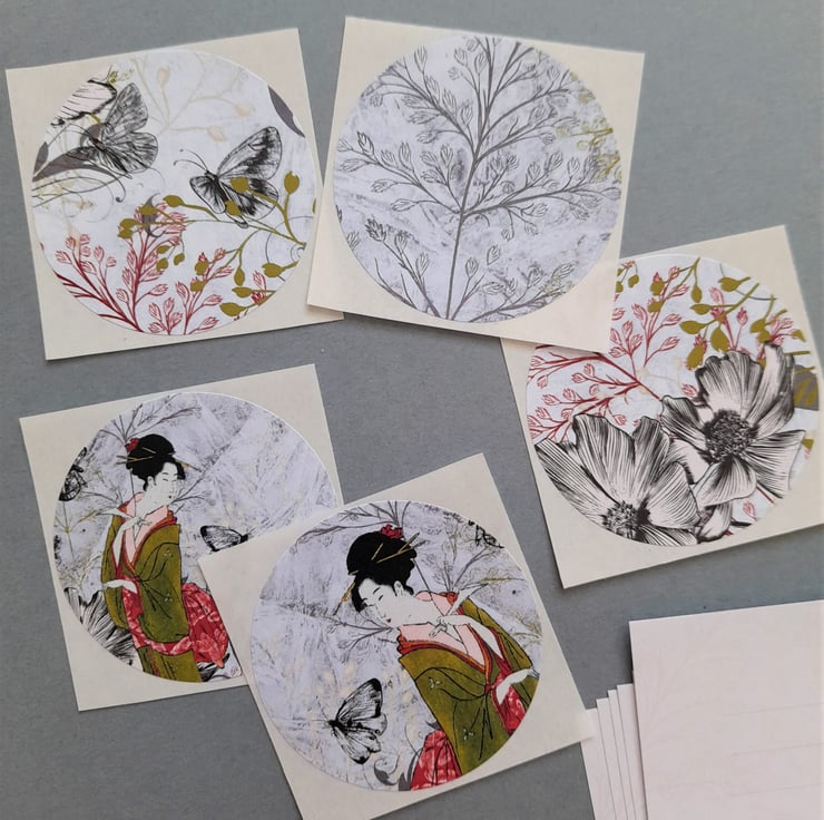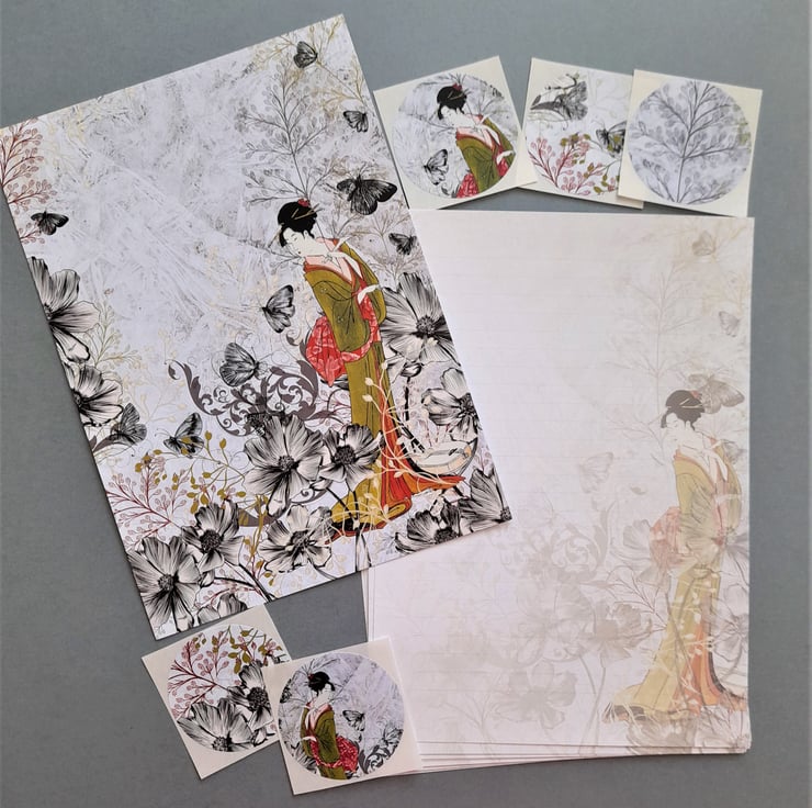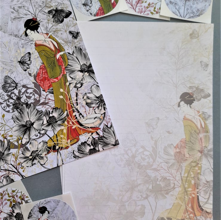 A set of 10 sheets of A5 size handmade letter writing / notepaper set with a design based upon Eishi Hosoda's Itsutomi illustration, which I have altered and collaged. The image on the notepaper has been made feinter to allow for it to be written over without dominating your handwriting.