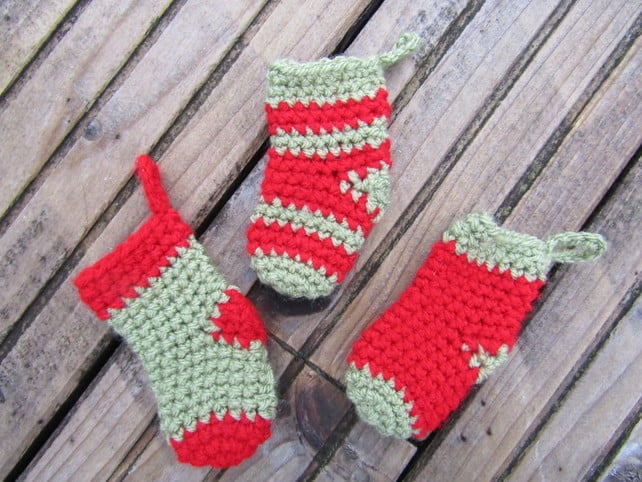 Beautiful mini crochet stockings made from acrylic wool in Christmas colours.