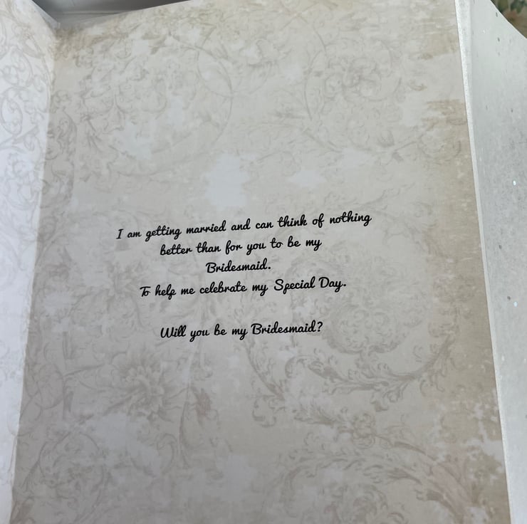 Inner sleeve in a muted scroll design reads: I am getting married and can think of nothing better than you to be my Bridesmaid. To help me celebrate my Special Day. Will you be my Bridesmaid?